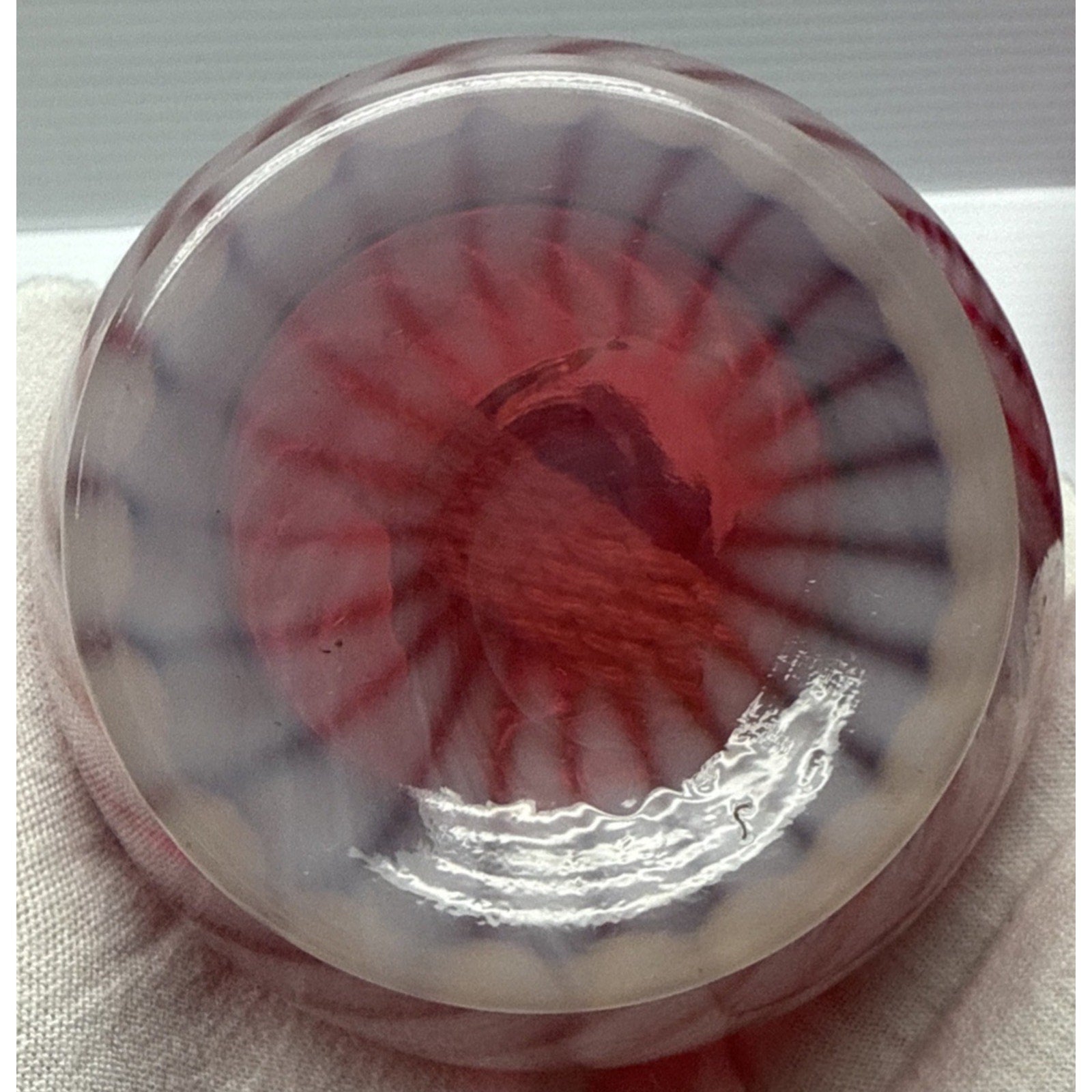 Stunning piece is very hard to come by. I am not positive it is Fenton. The red hurricane has small chips along the rim. The lampshade has small chips along the rims along with scuffs and scratches. The wick is visible and clean on the inside. The metal is discolored and worn. The rim rim for the shade is bent and uneven. The lamp may require additinal cleaning.