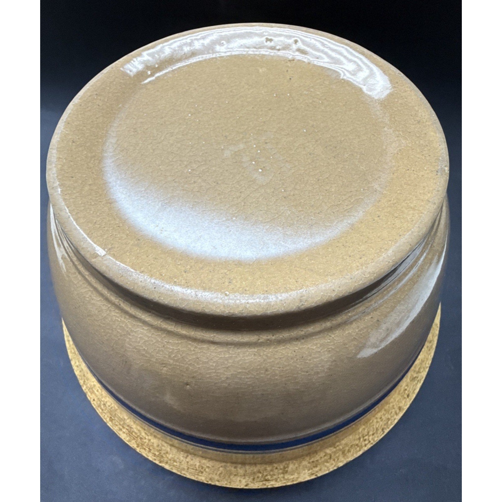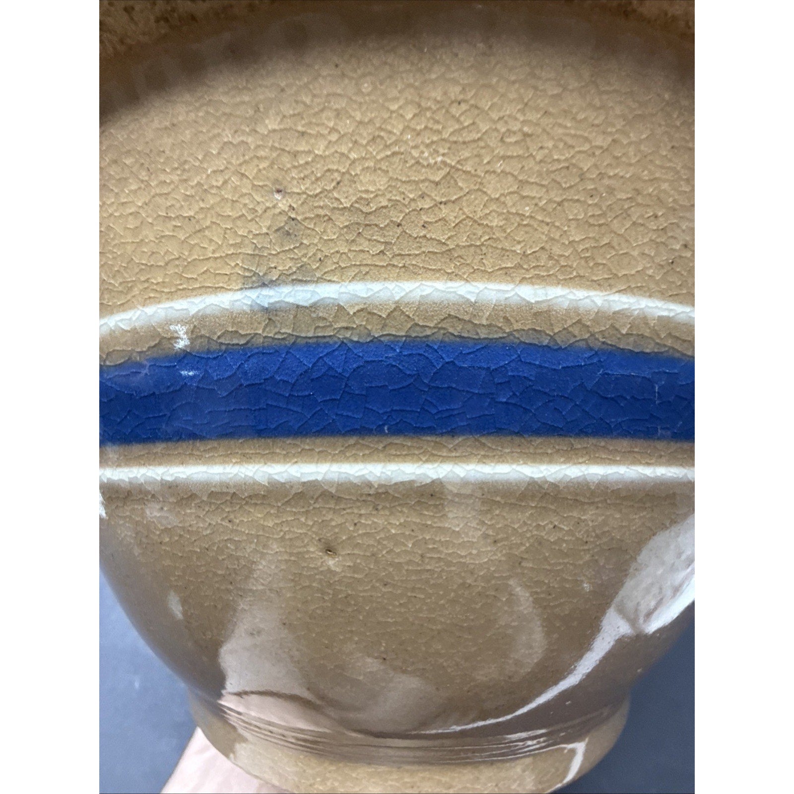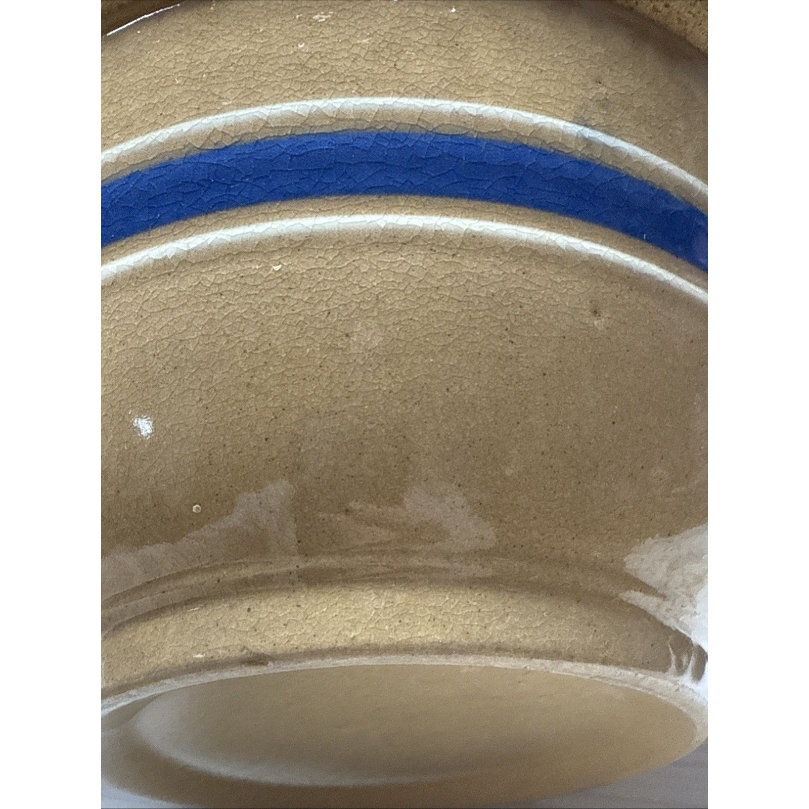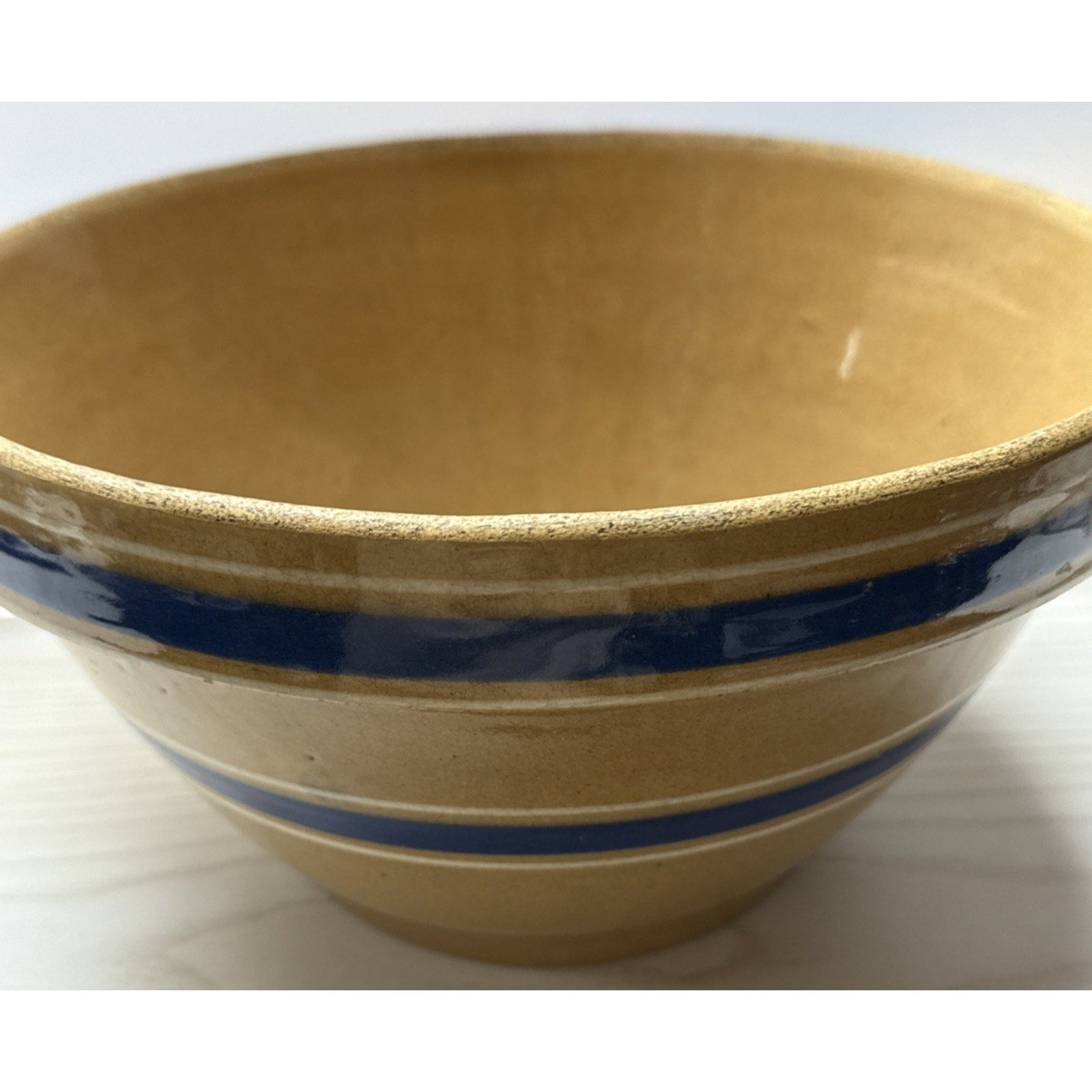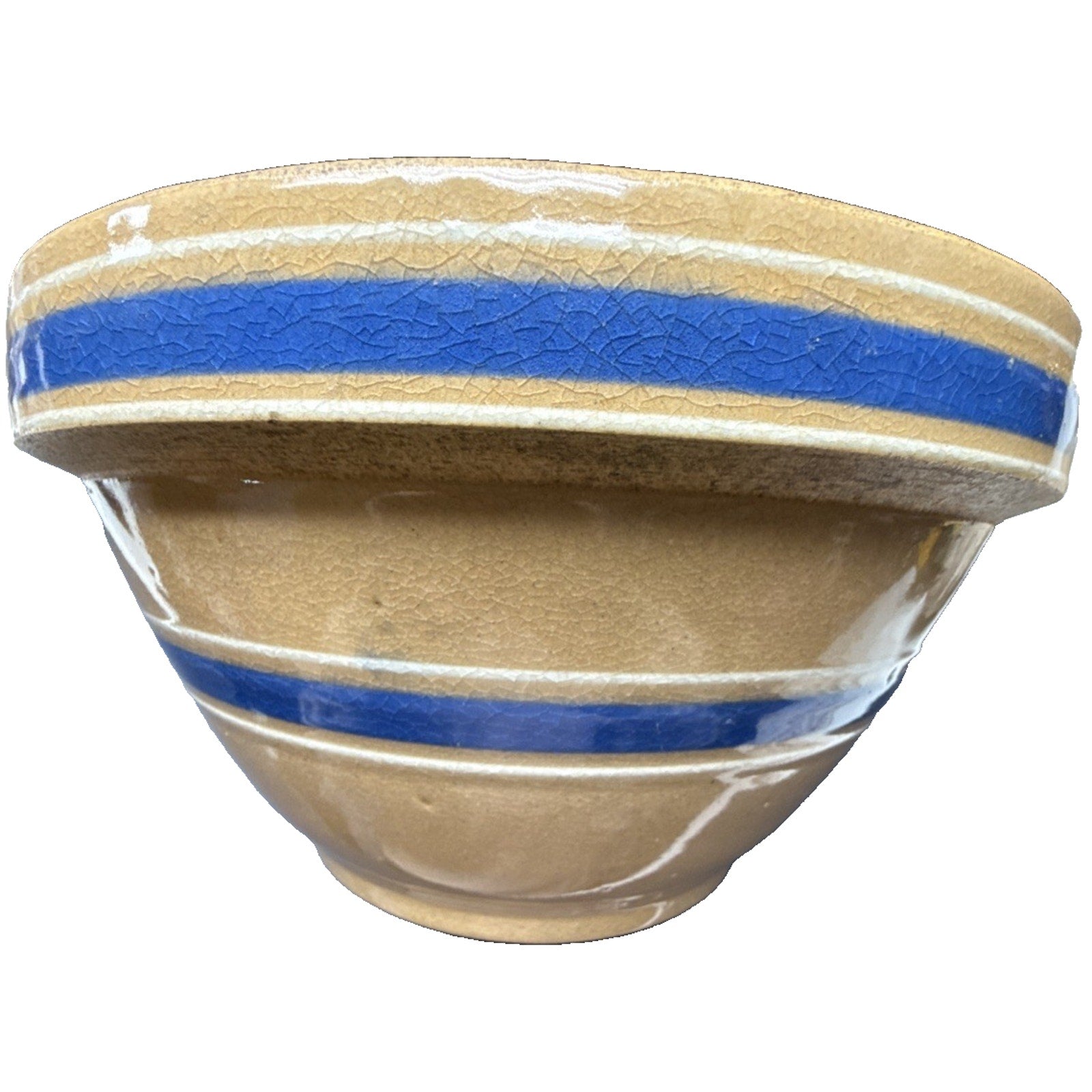 Antique Farmhouse 10.5” Yellowware Pottery Mixing Bowl 6 Stripe Blue White As-Is