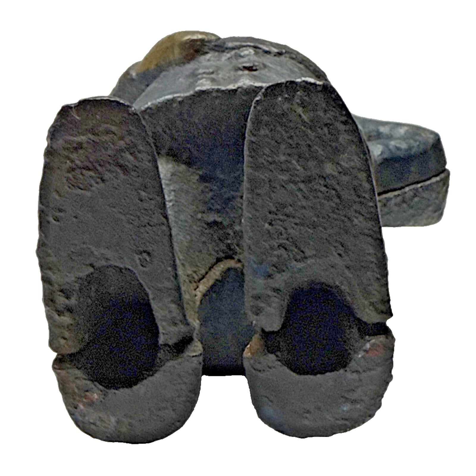 Old bank is not marked. I am unsure the maker. There is a hole in the front of the suit which I believe is the way that it was made. The hole is symmetrical. There is much wear to the paint and the metal is worn and rough in areas.
