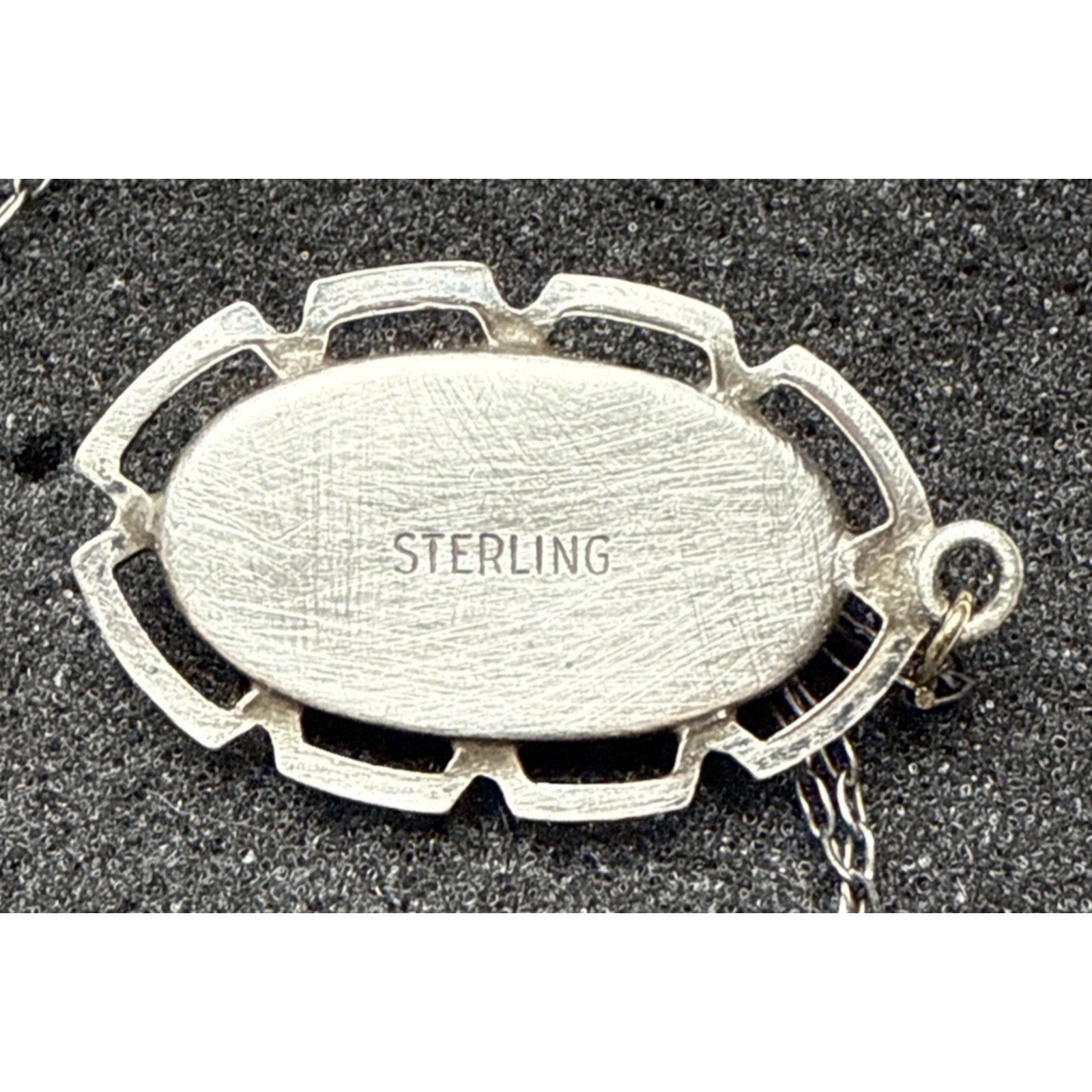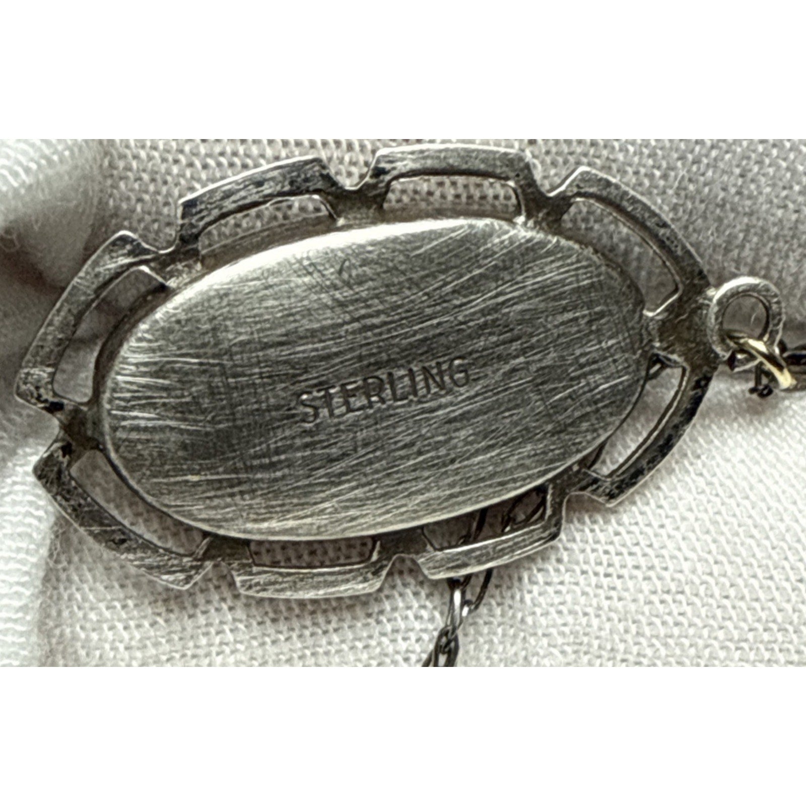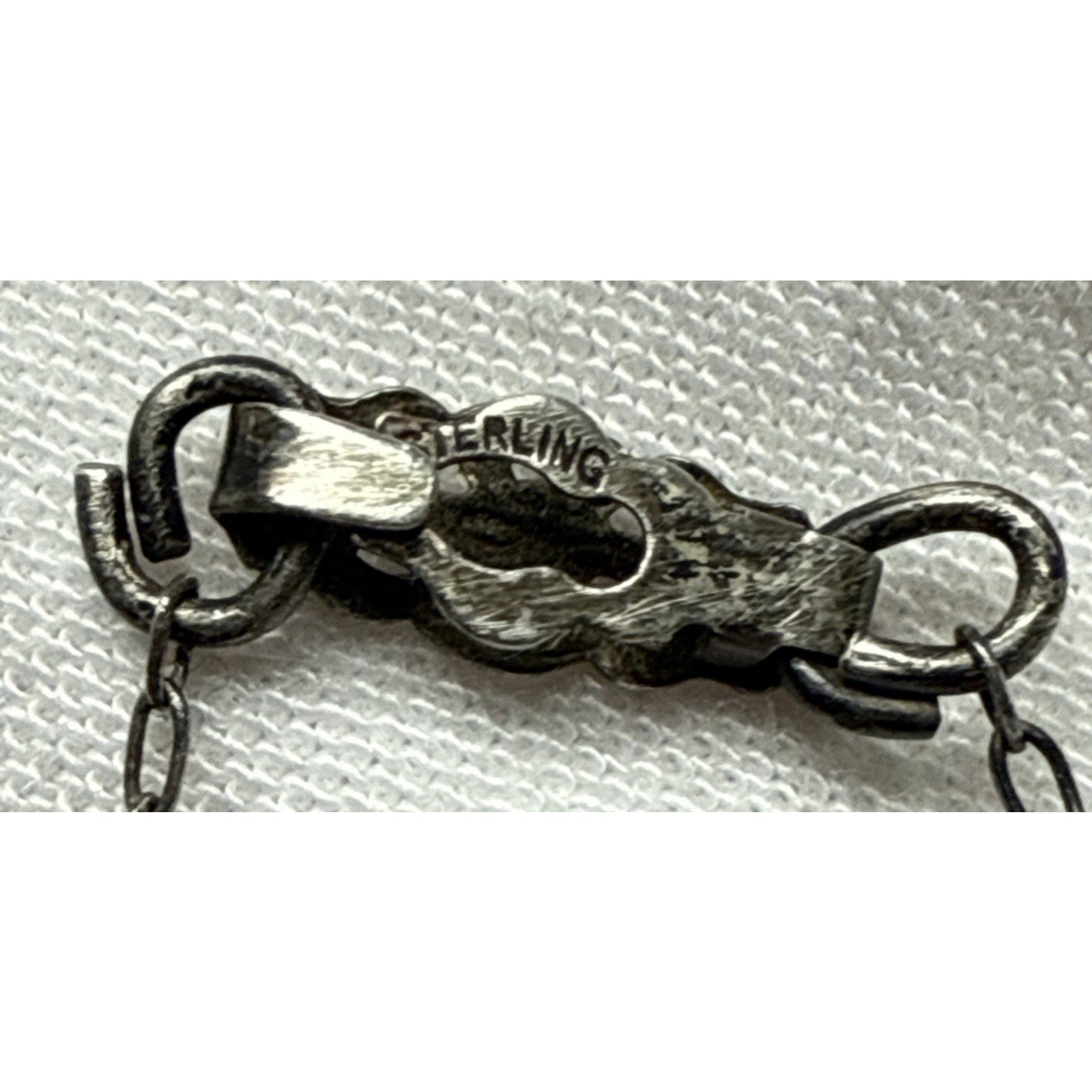 Stunning older piece. The chain is rather delicate and will require cleaning. I did not polish it. The chain is approx 20.5 inches long and it is adjustable. The clasp is marked. The ring holding the chain to the pendant does not appear to be original, or silver.