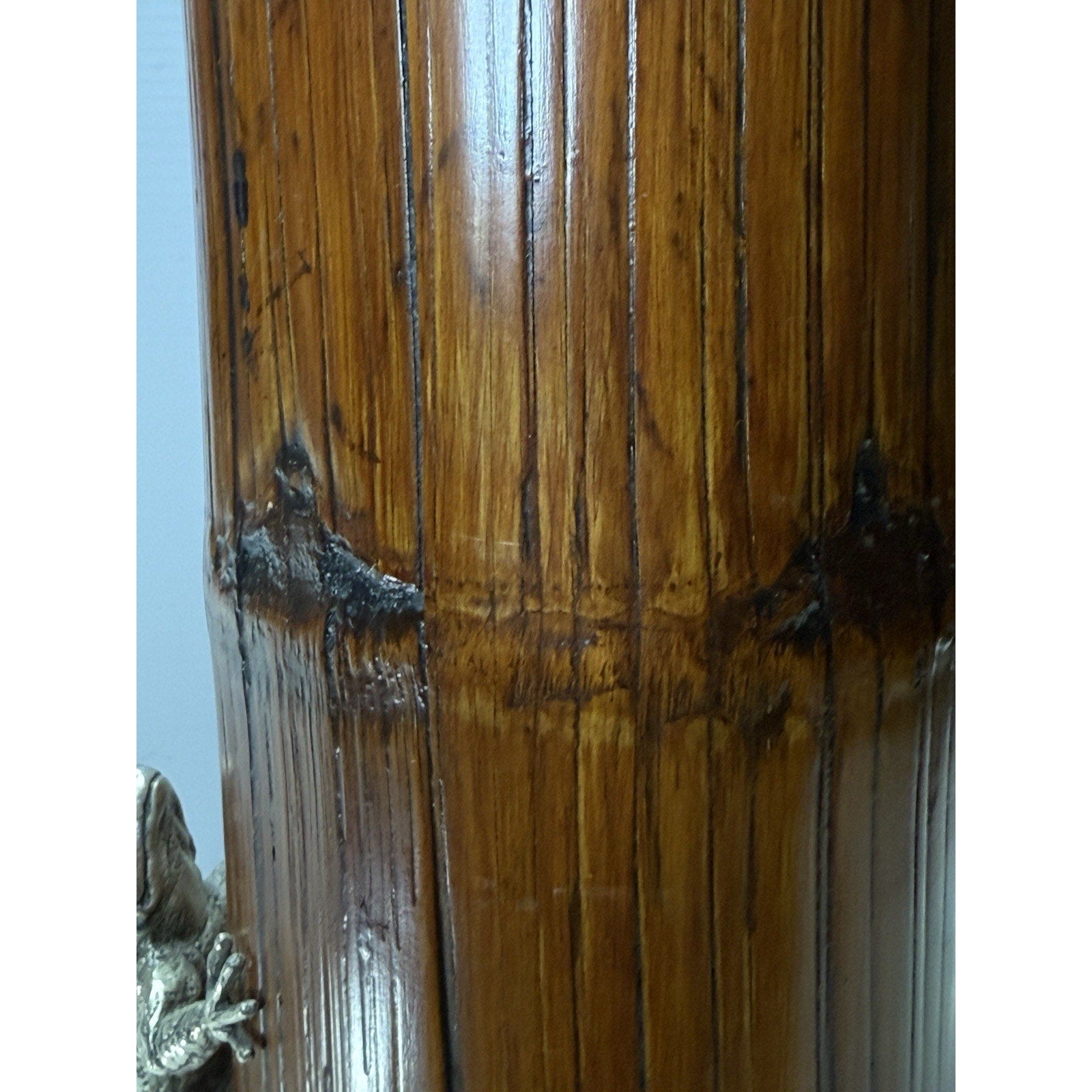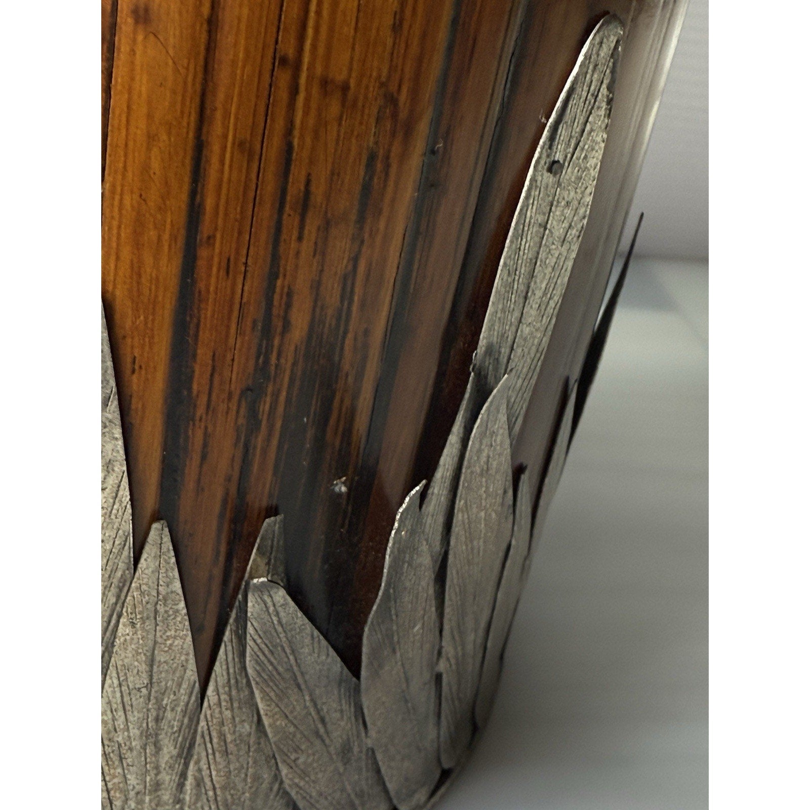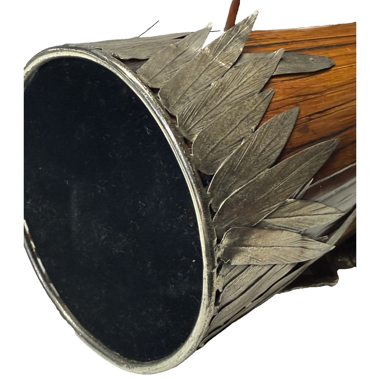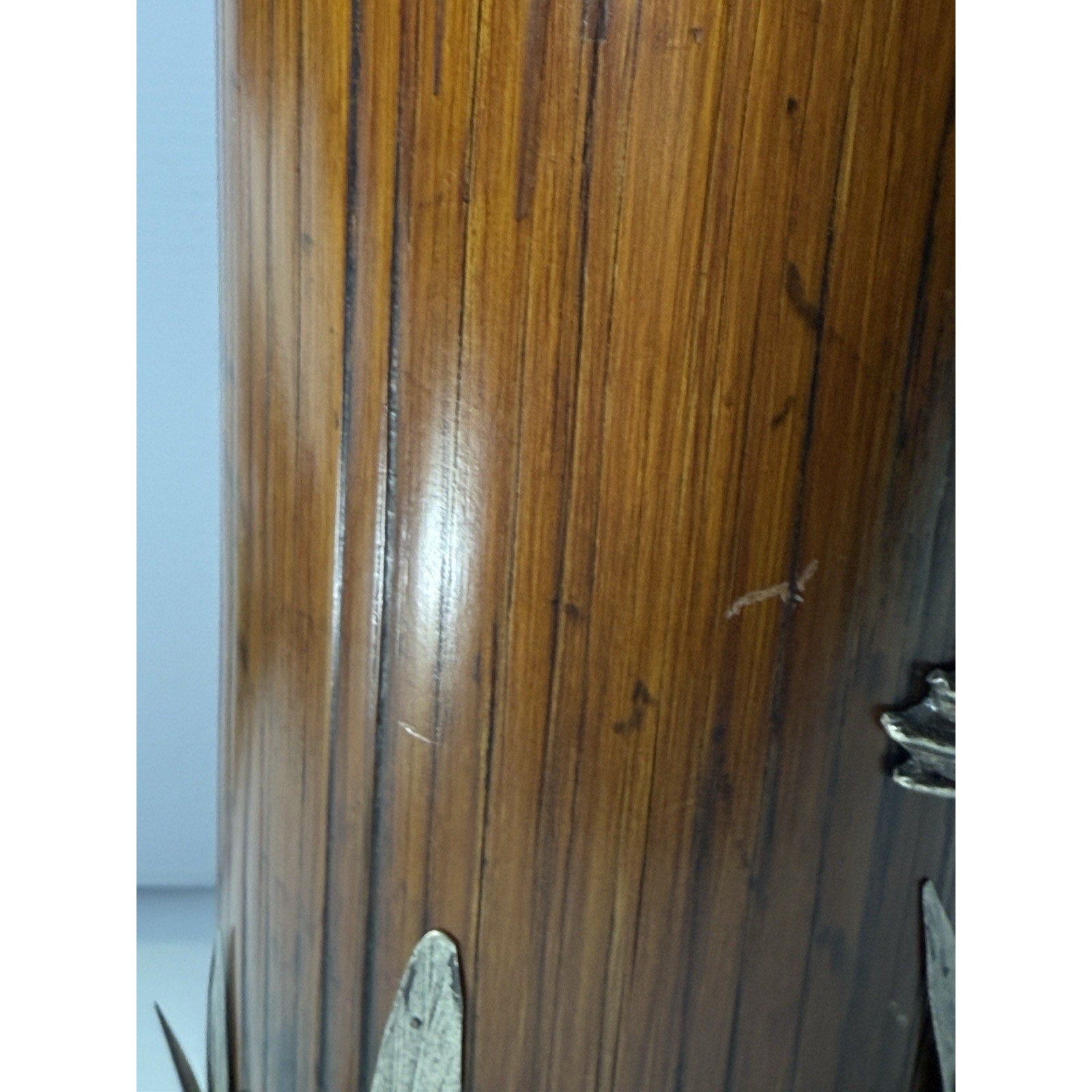 Stunning older piece. It is in pretty good condition. Silver is discolored, and has dented, wavy spots in some areas. The grass is bent in areas, and there are small chips to the wood.