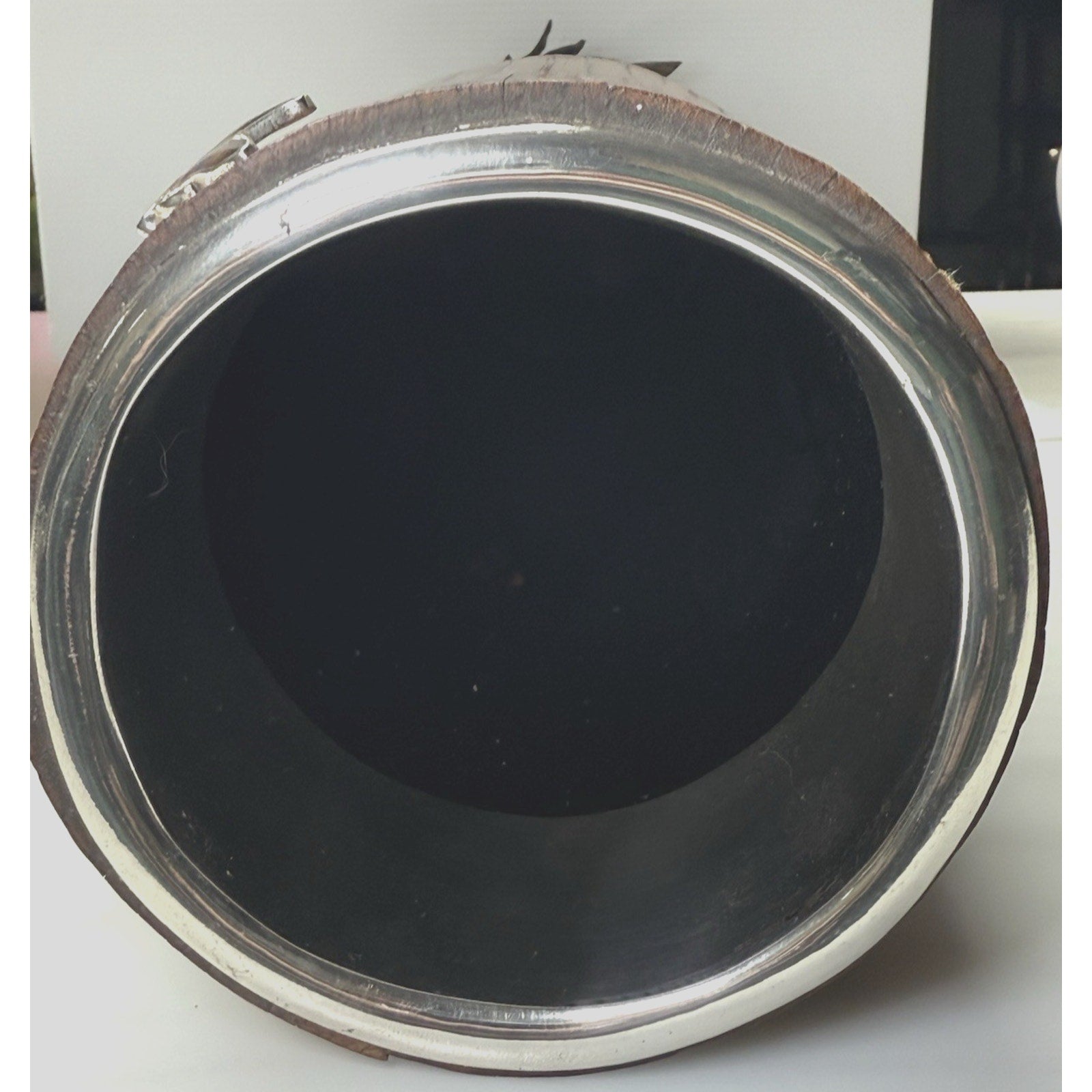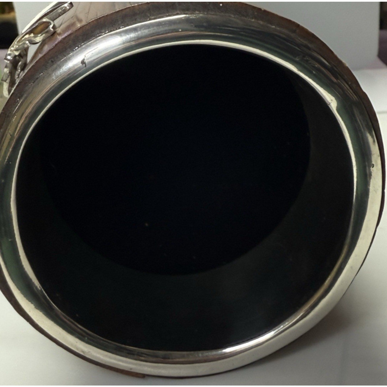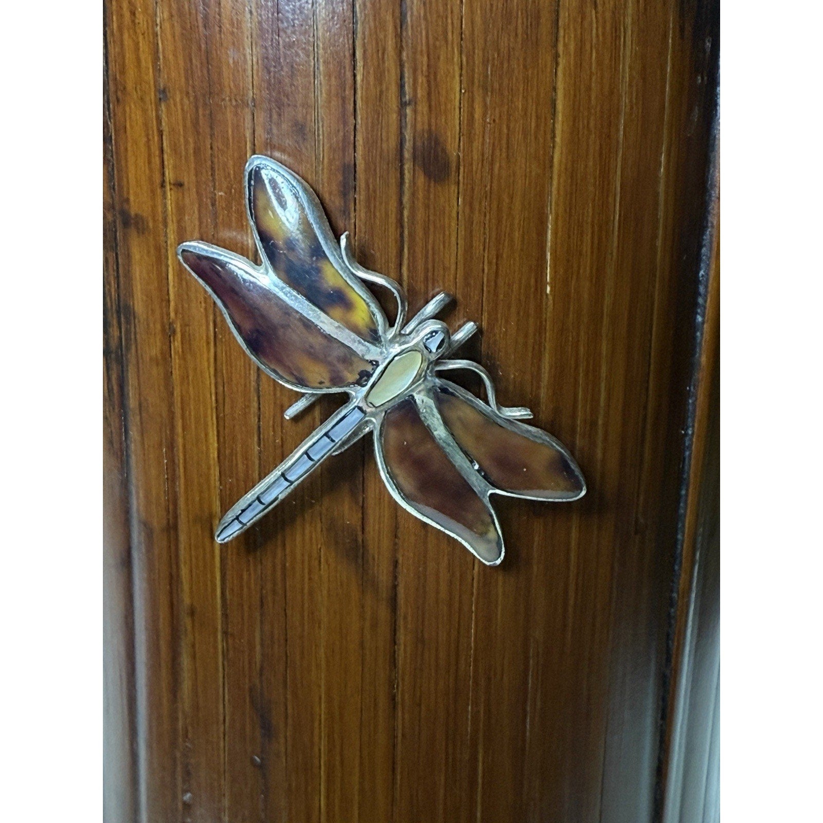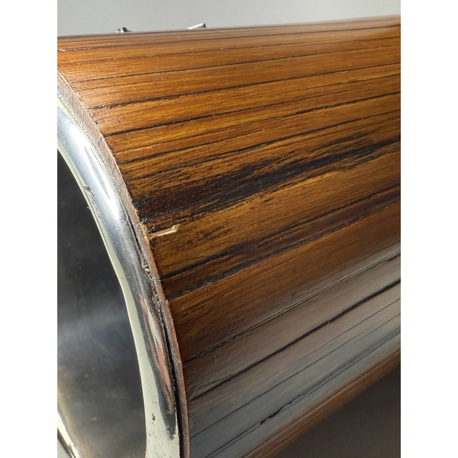 Stunning older piece. It is in pretty good condition. Silver is discolored, and has dented, wavy spots in some areas. The grass is bent in areas, and there are small chips to the wood.