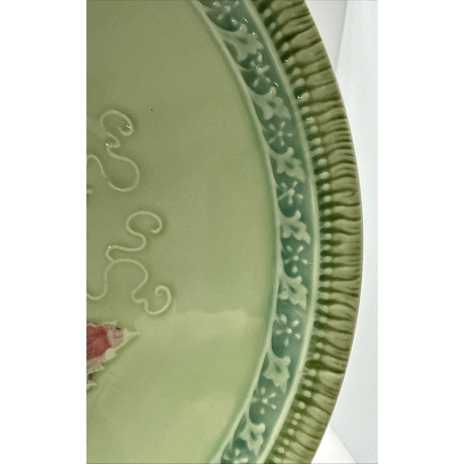 Absolutely stunning plate measures 10 inch diameter. There is wear to the glaze where the paint/glaze is worn and chipped off. There is wear such as scratches, scuffs, and discolorations. Please review the pictures closely.