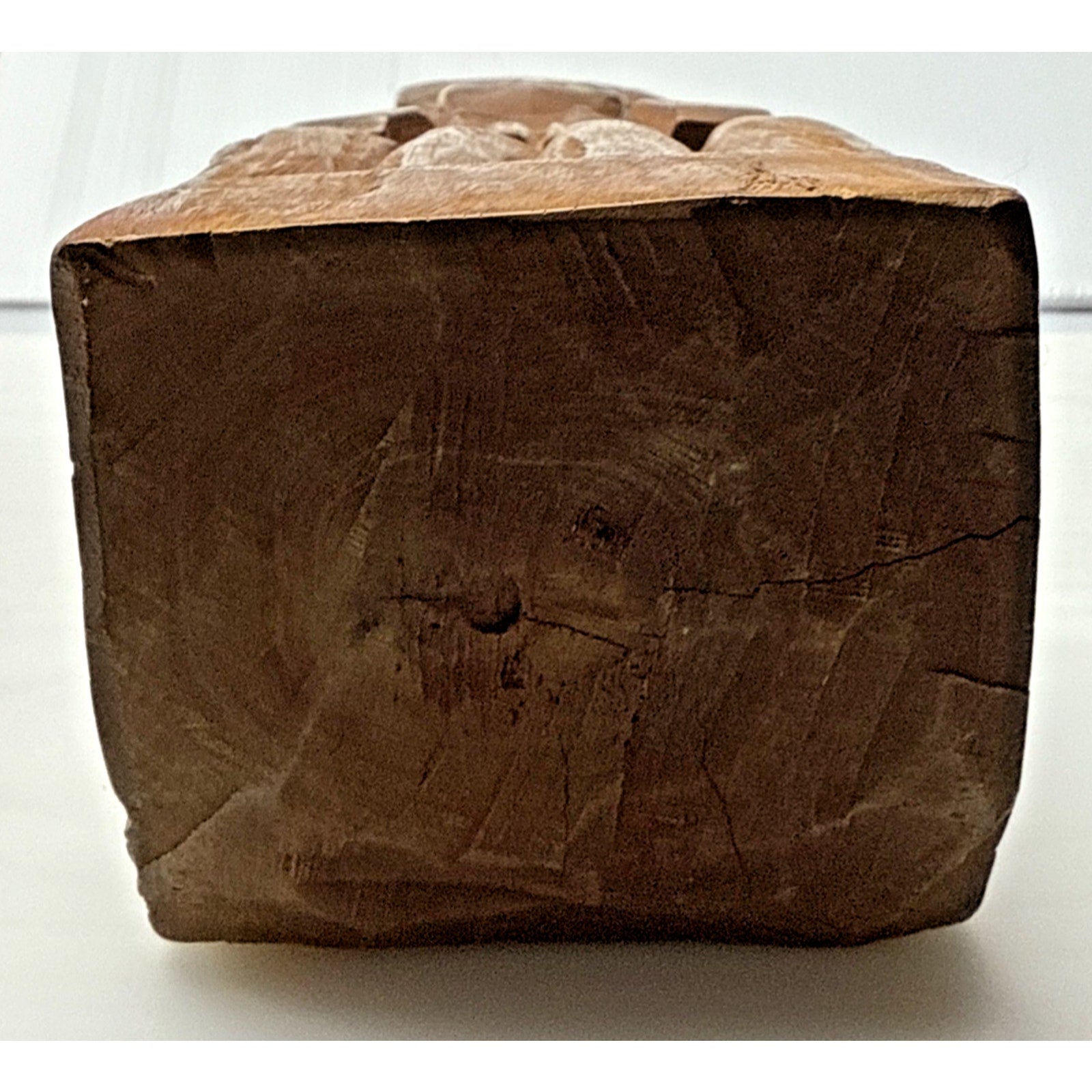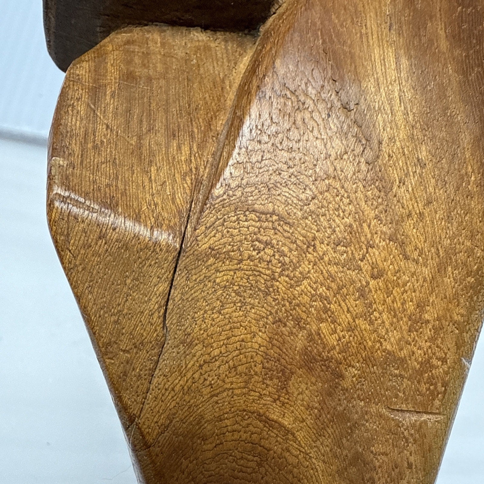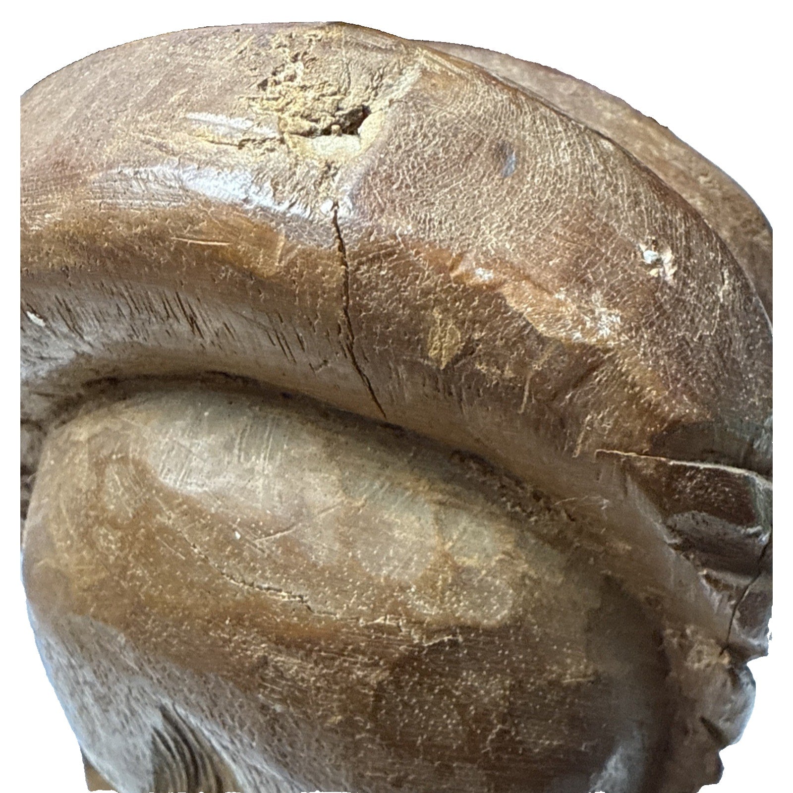 Stunning piece is quite detailed. It is in good condition, but there are discolorations, scuffs, scratches, cracks, and chips in the wood. There may be water marks in the wood. The shell eyes appear to be discolored as the sculpture is stained.