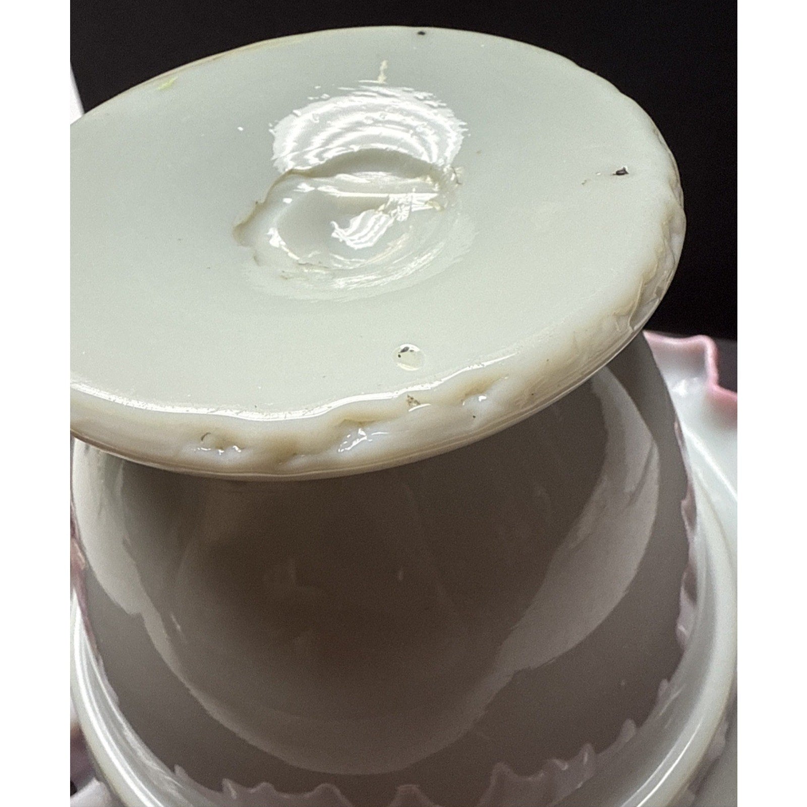 Stunning hand painted piece is in pretty good condition considering the age. Small imperfections along the crimped rim such as scuffs, scratches, or small chips. The very bottom along the base has multiple manufacturing flaws such as dents.