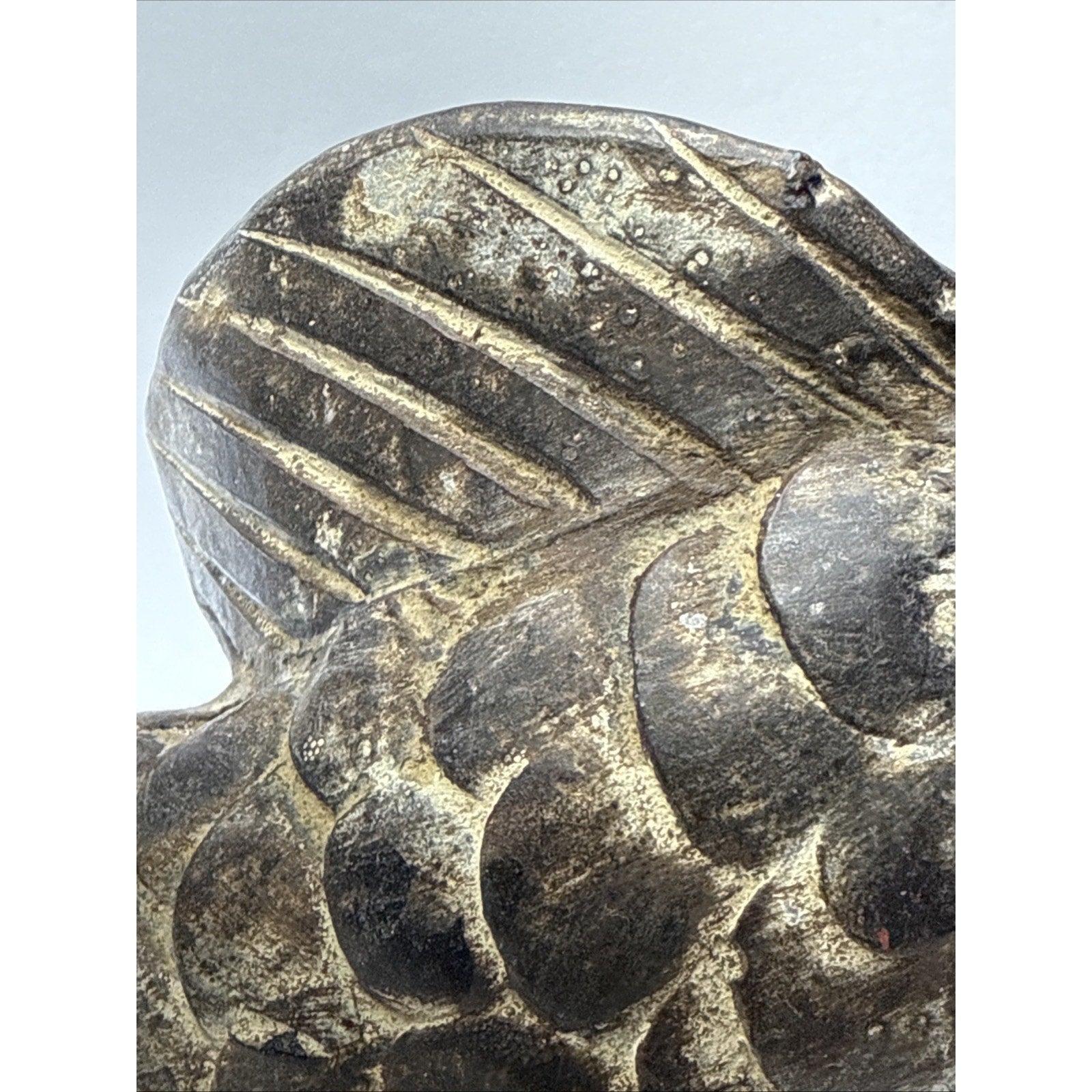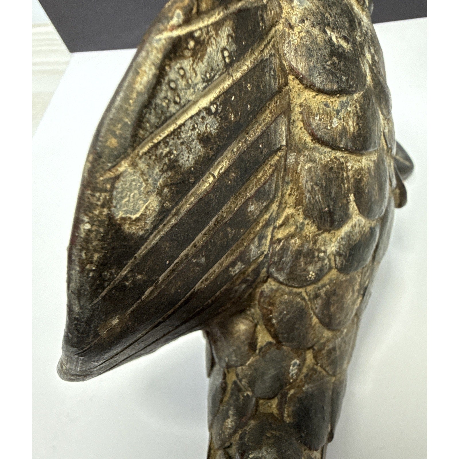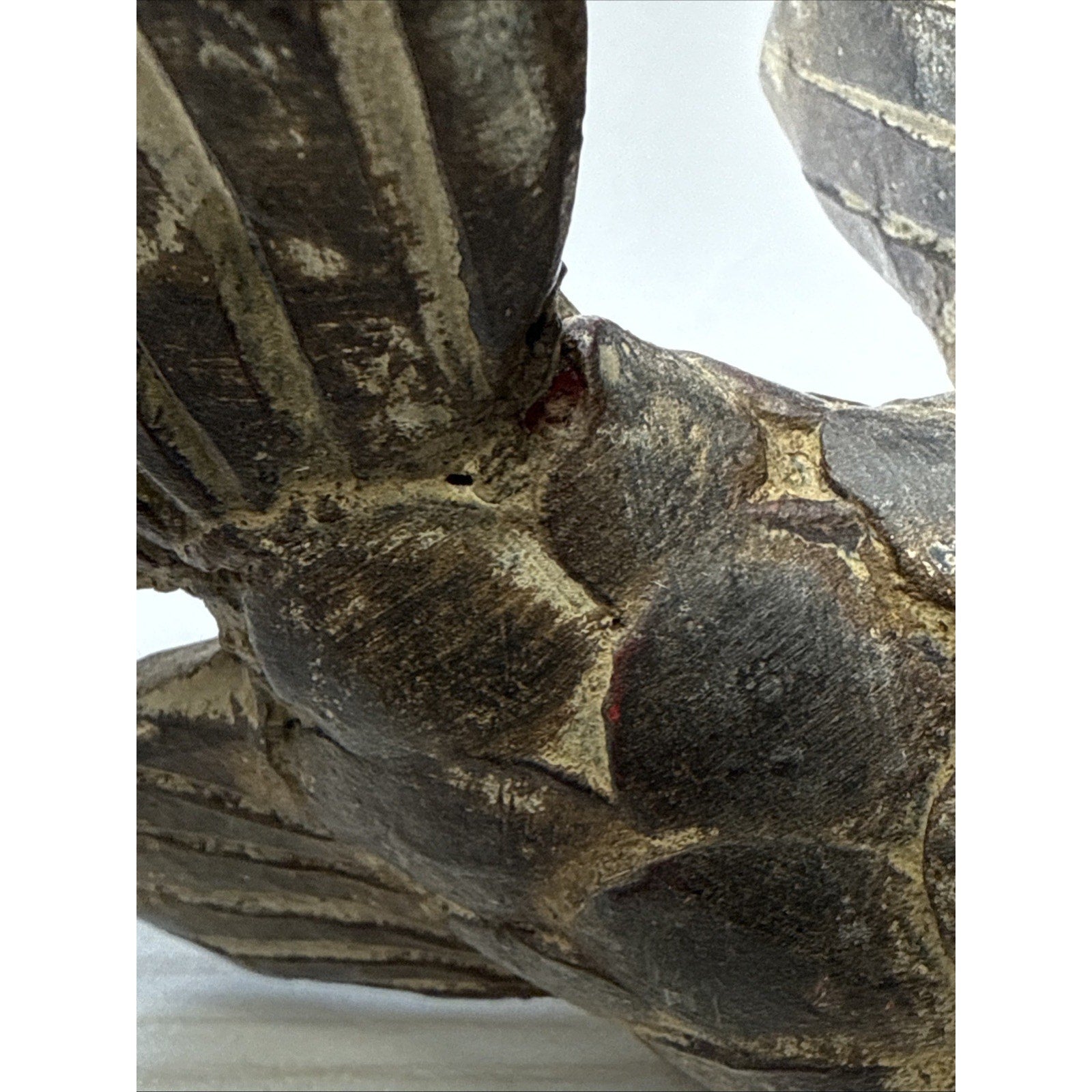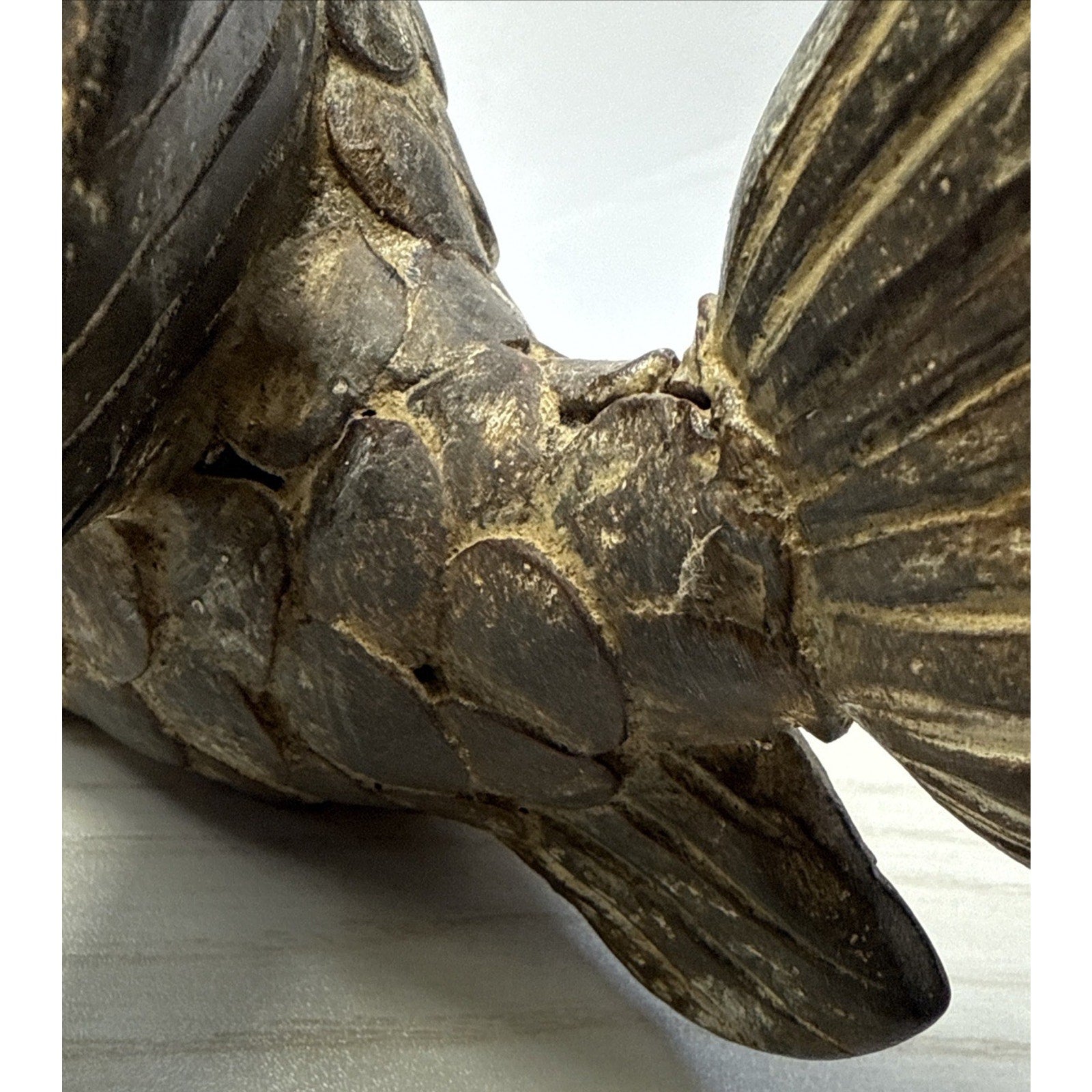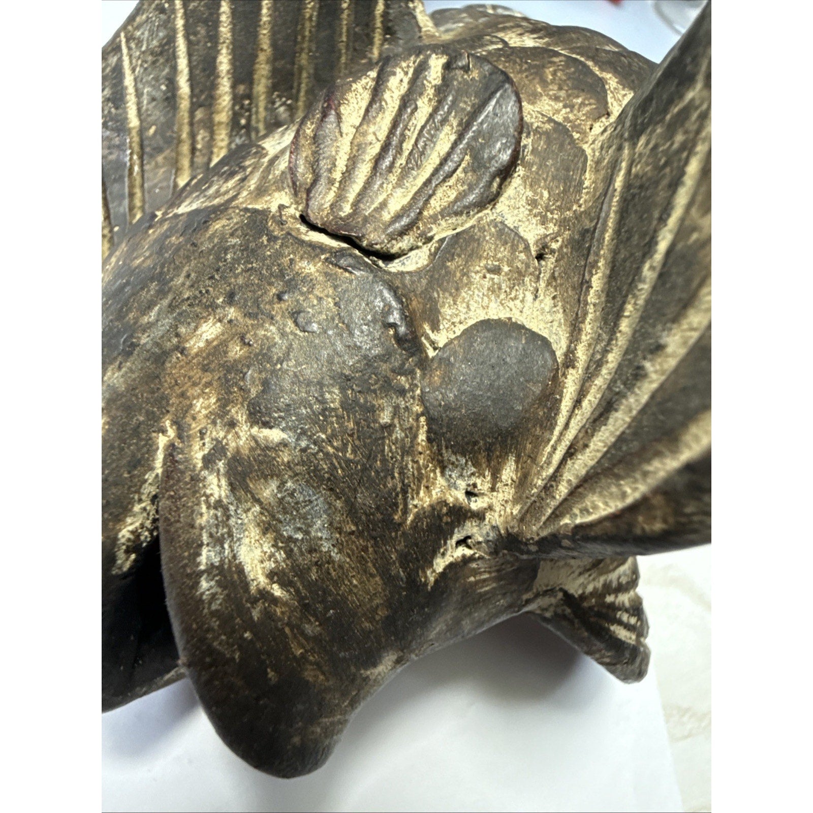 There are rough spots and discolorations. On the very bottom, there is a small hole most likely from manufacturing. The glaze is worn in areas particularly on the back fin/tail. You can see through it, and could break off.