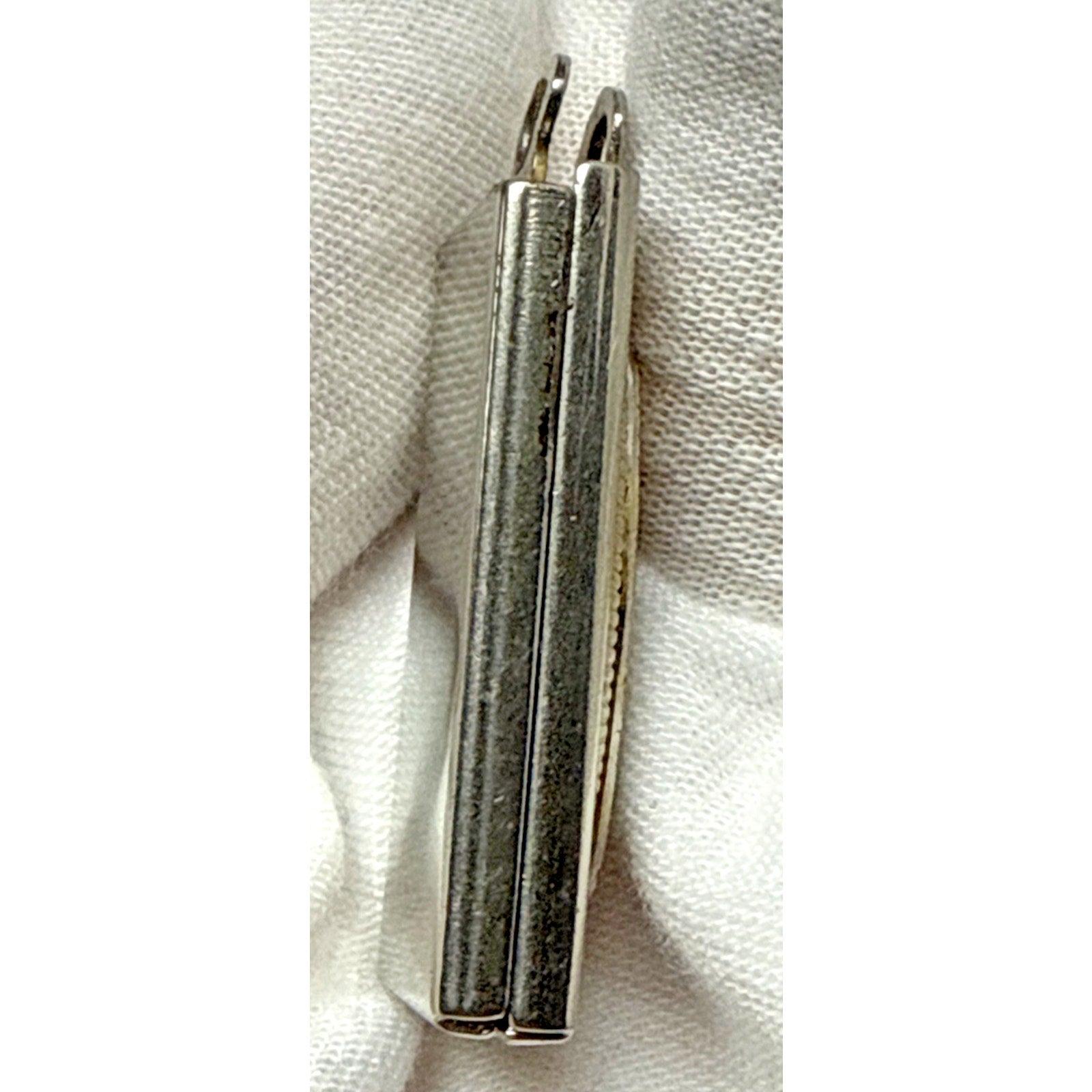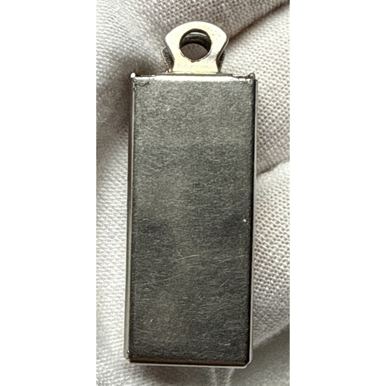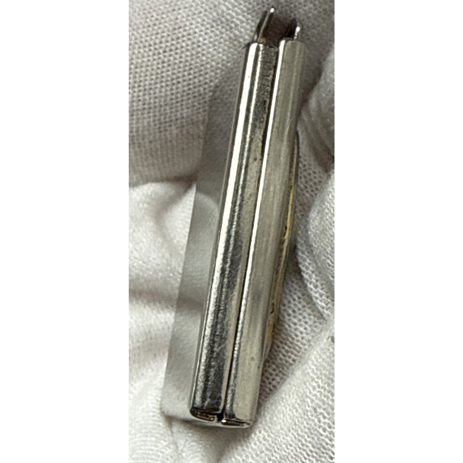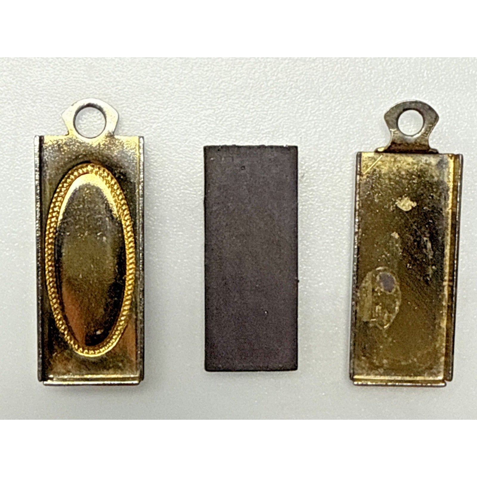 Item is in pretty good condition, but there is wear and discolorations. There is a magnet on the inside holding it together. I believe it was once glued. It measures approx 1.25 inches long x .5 x .25.