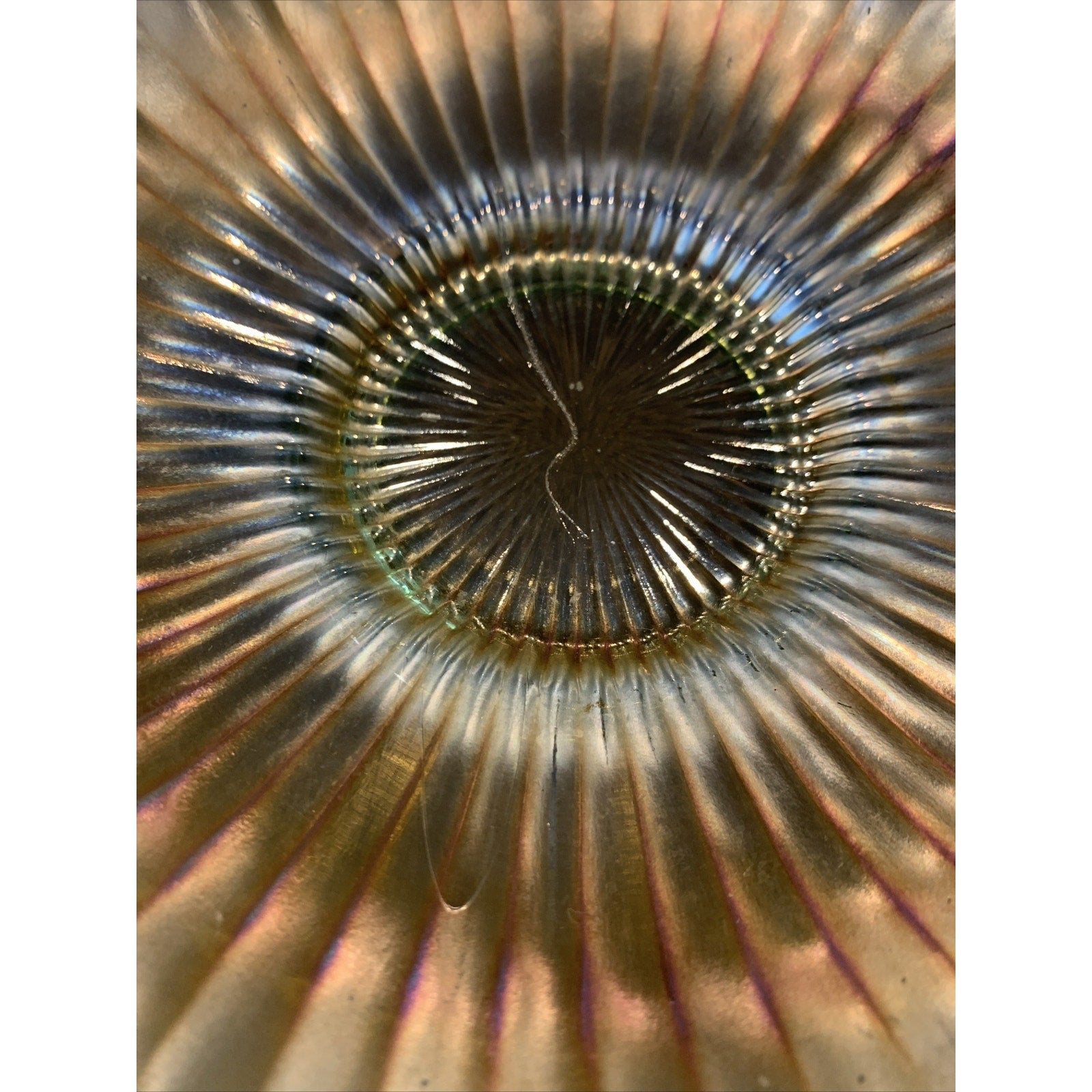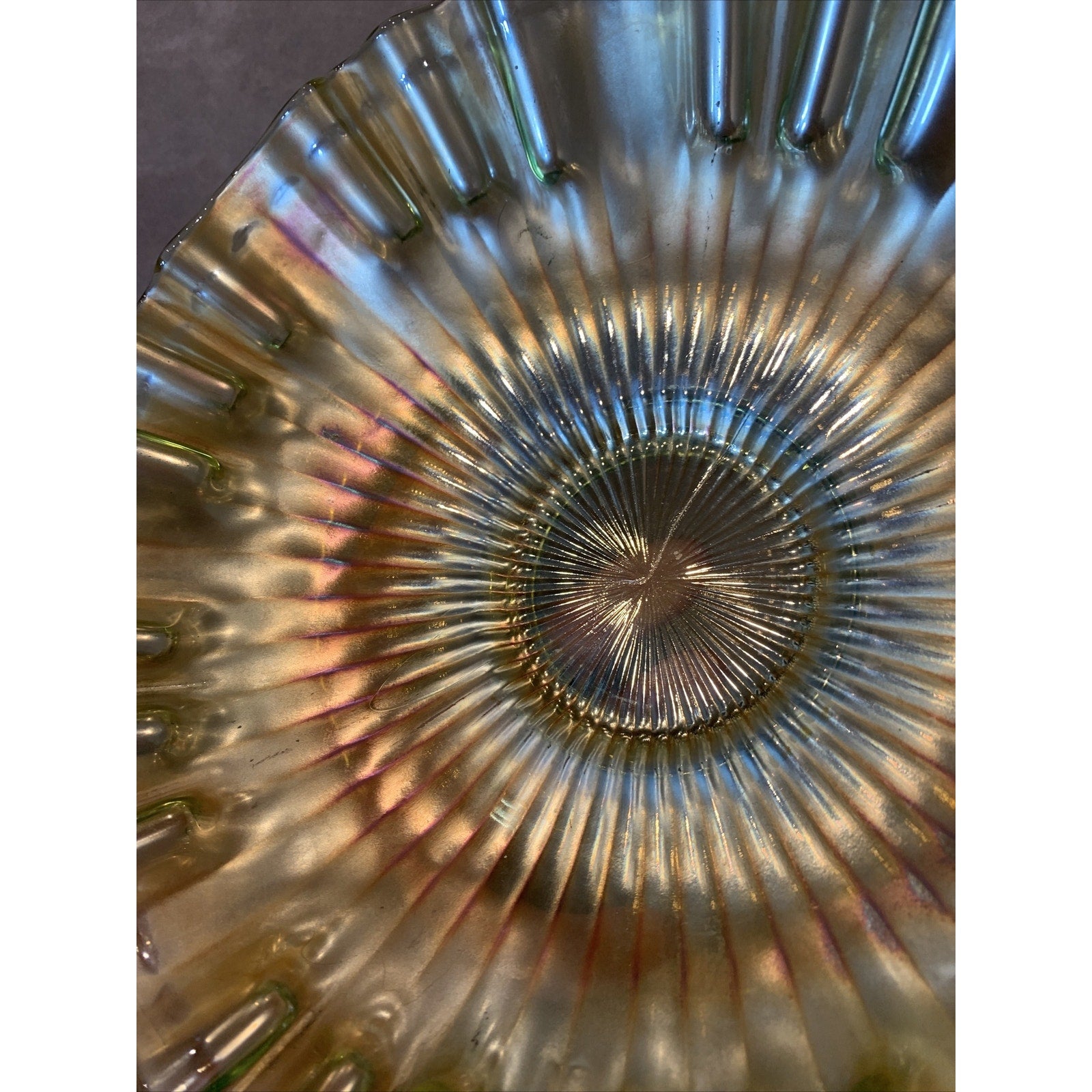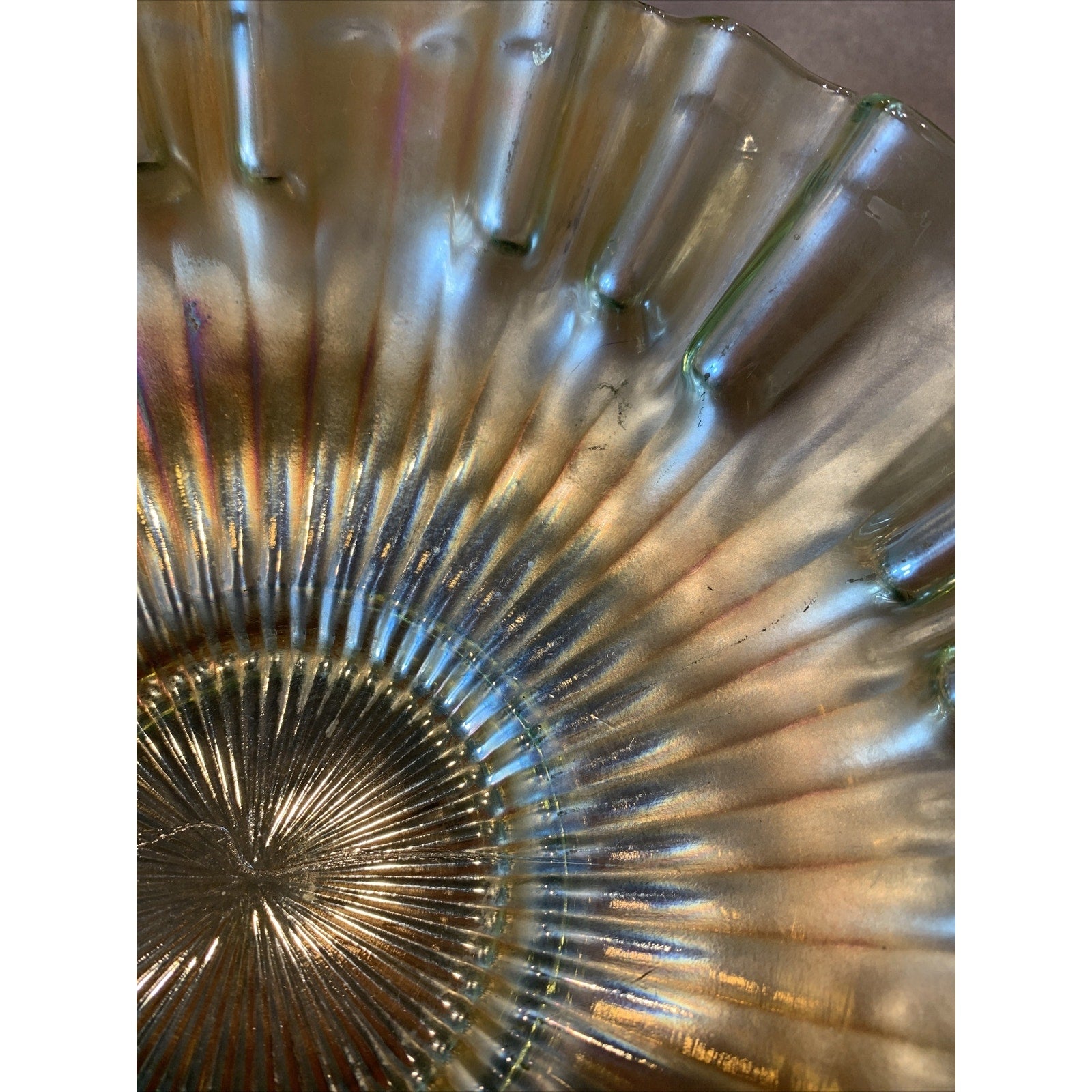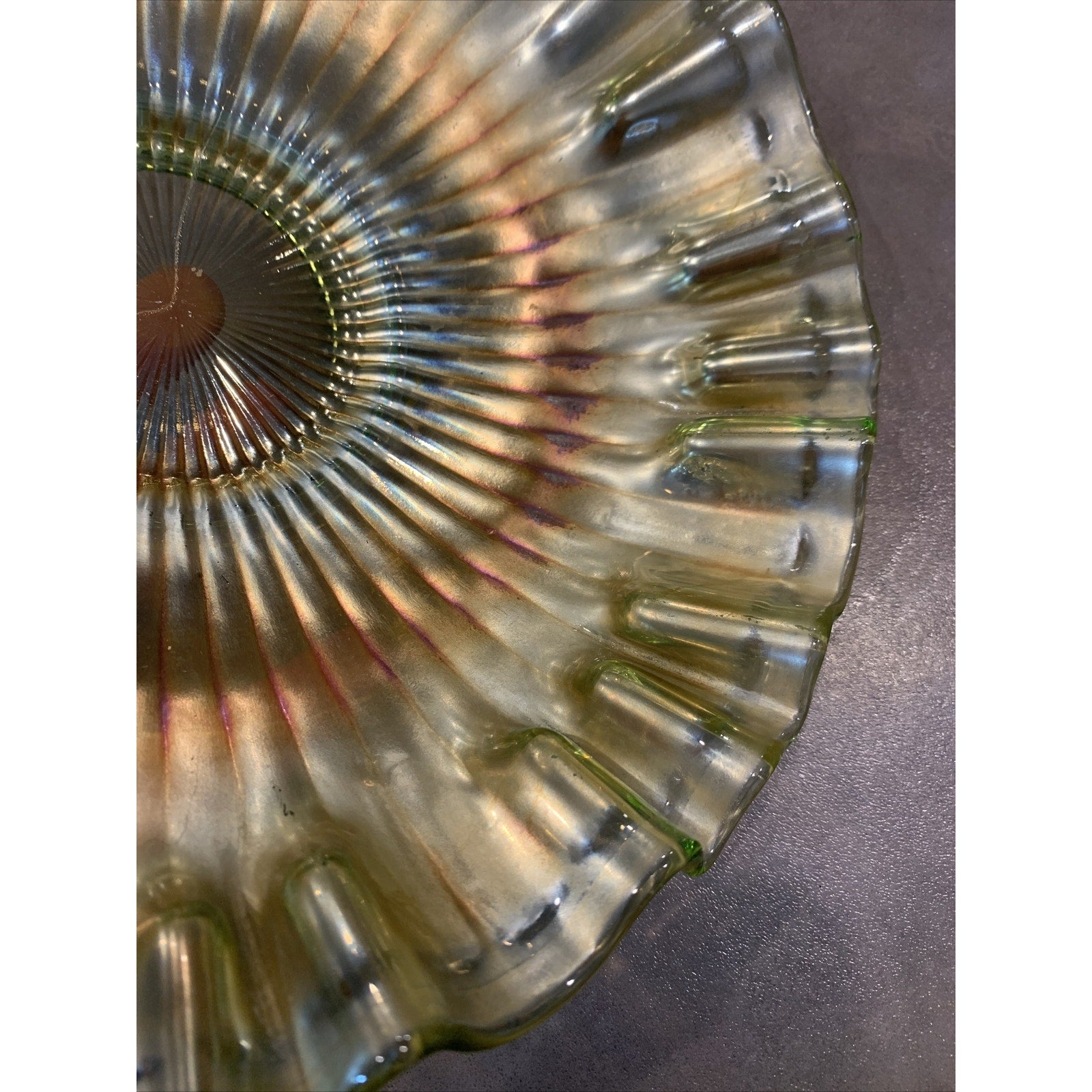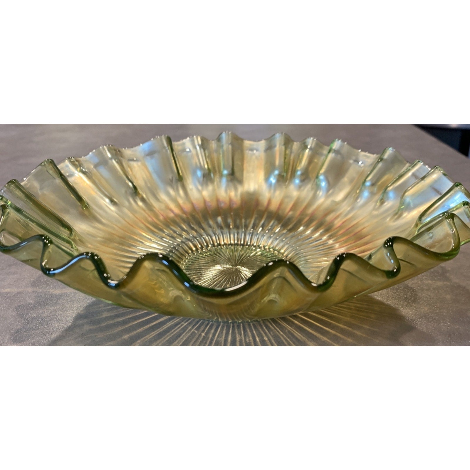 Vintage Fenton Green Carnival Glass Stippled Rays Ruffled Crimped Bowl