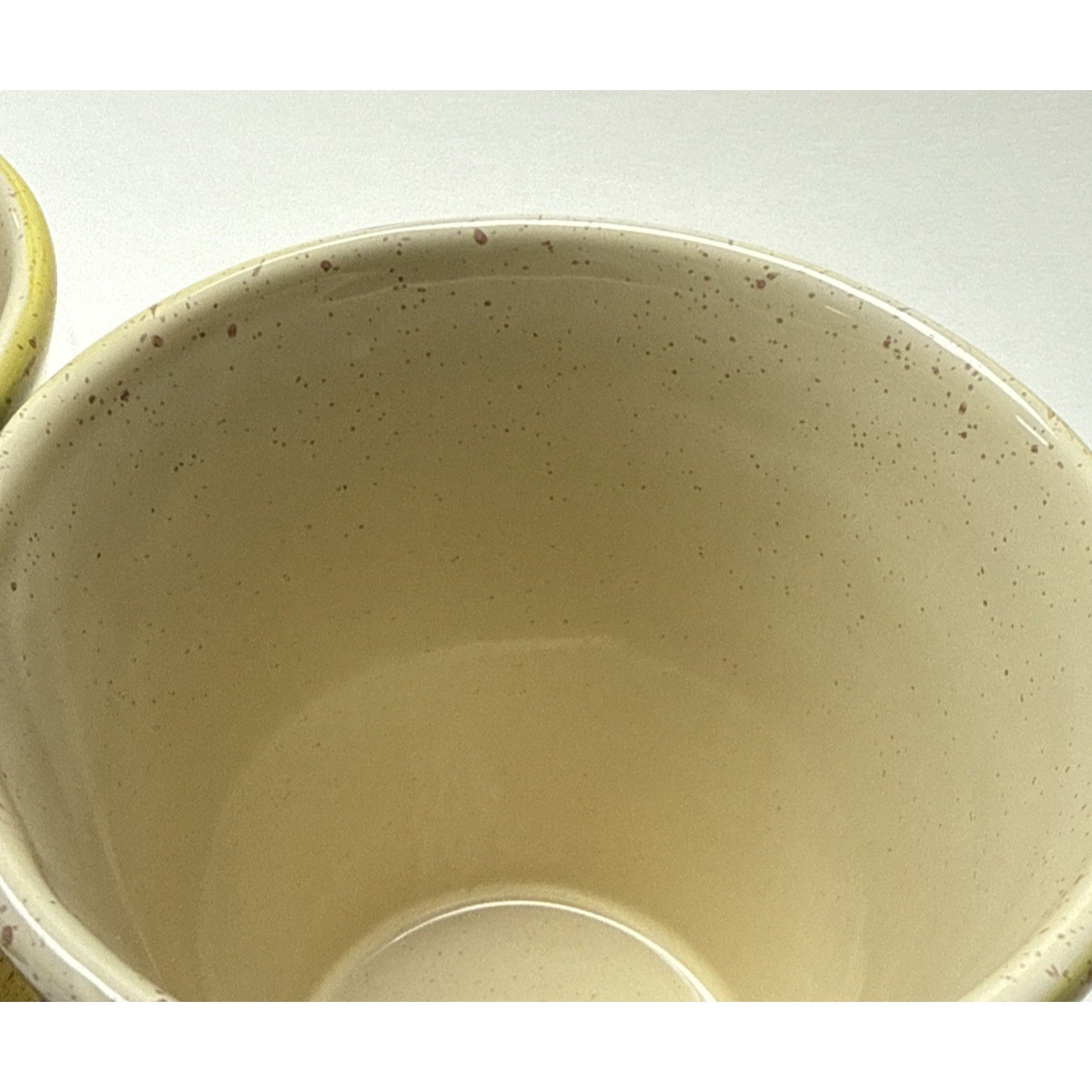 Super cute set is in good condition. There are no chips or cracks. They stand approx 4.5 inches tall x 4 inches on top x 2.75 on the bottom. The width including the handle is approx 5.5 inches.