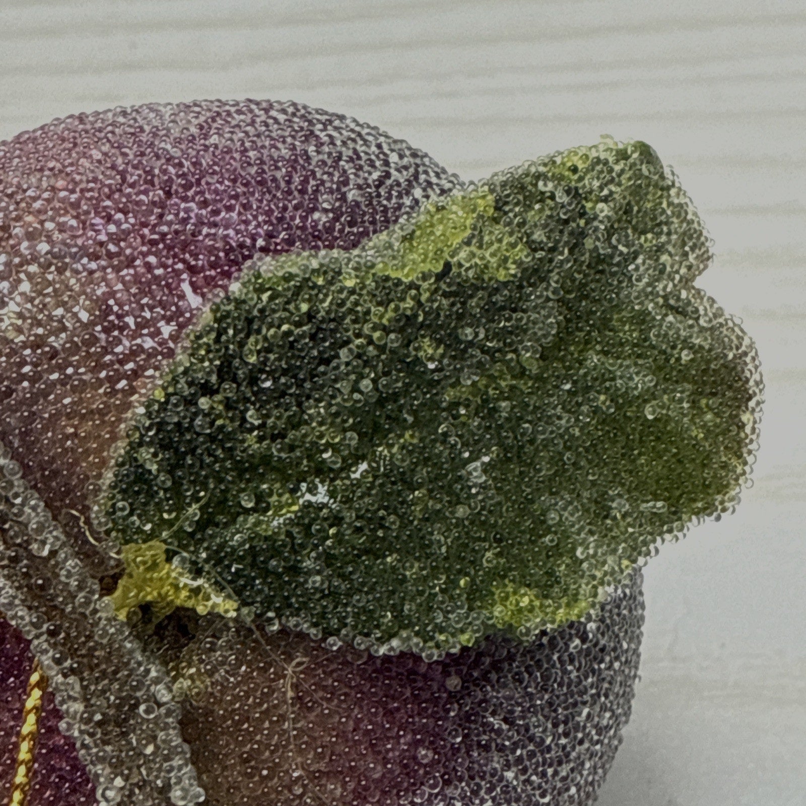 Items were acquired from an estate. They are in good condition, but there may be areas on the fruit where the beads are worn or missing. There is also visible glue on some stems. The fruit is life size.