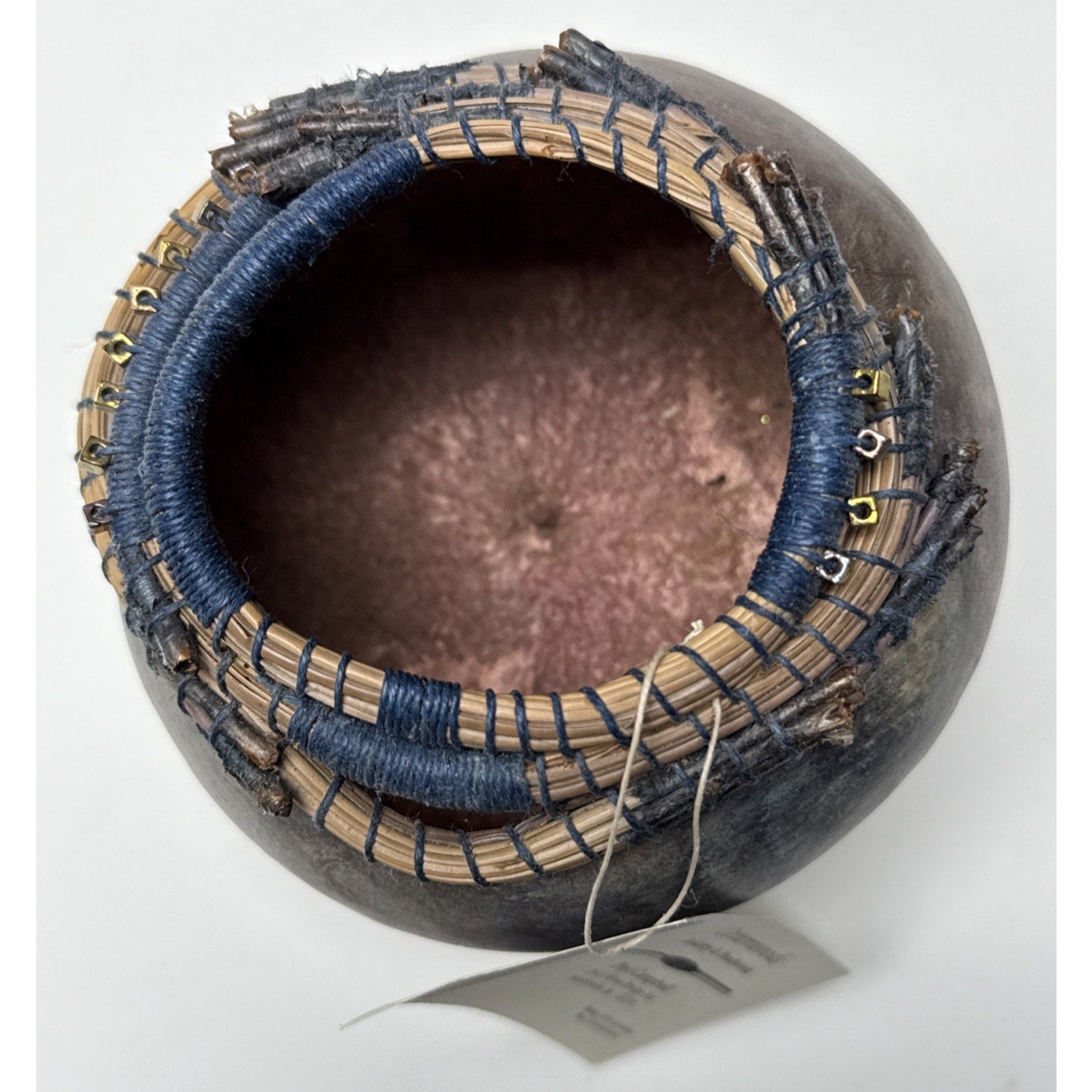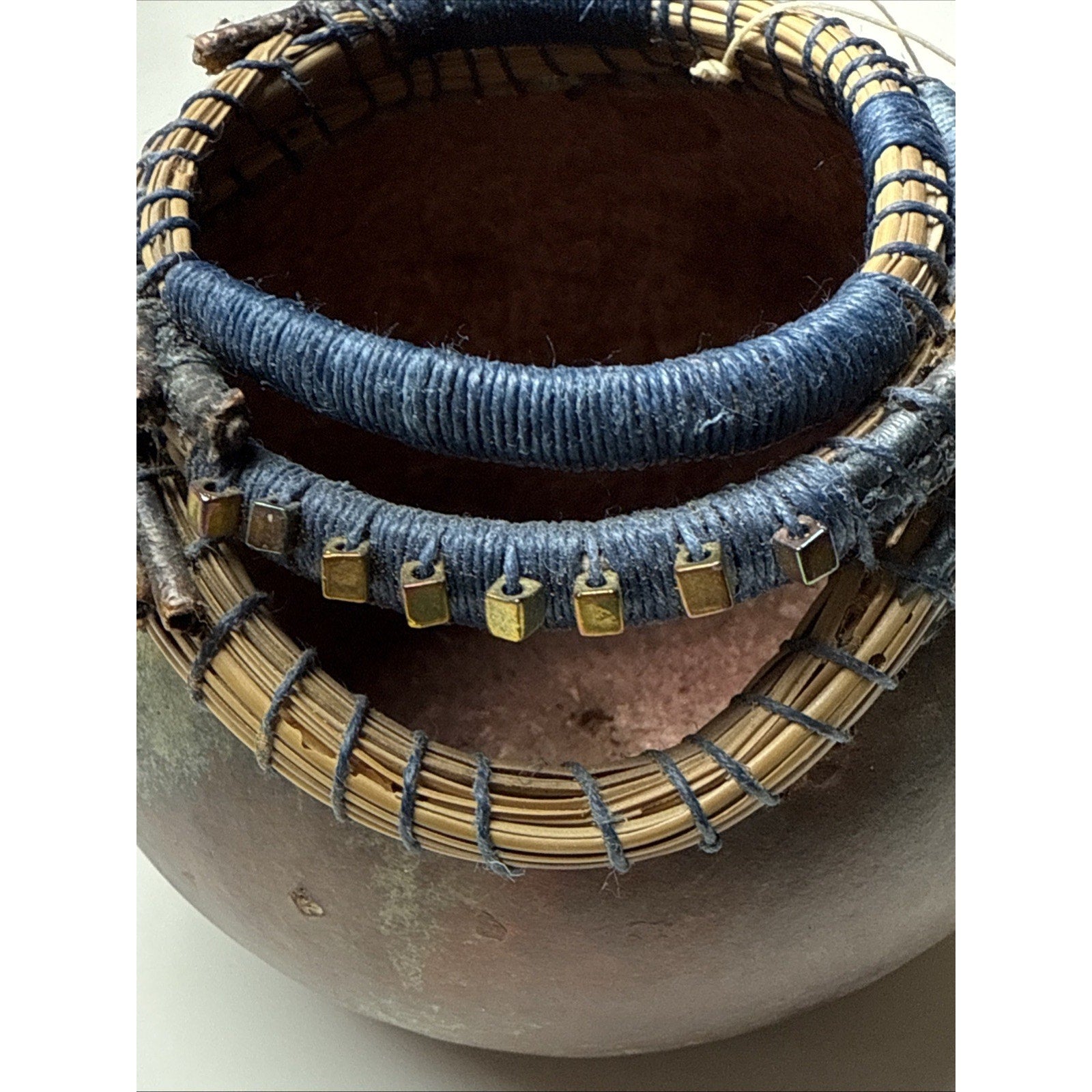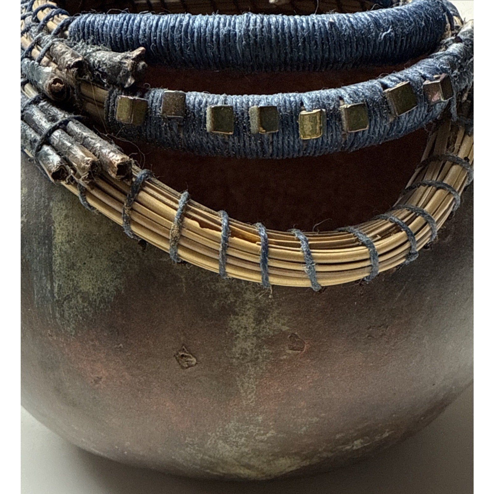 Item is in good condition, but may require additional cleaning. The wound wicker at the top is threaded and beaded. It measures approx 4.25 inches tall x 5.25 inches wide.