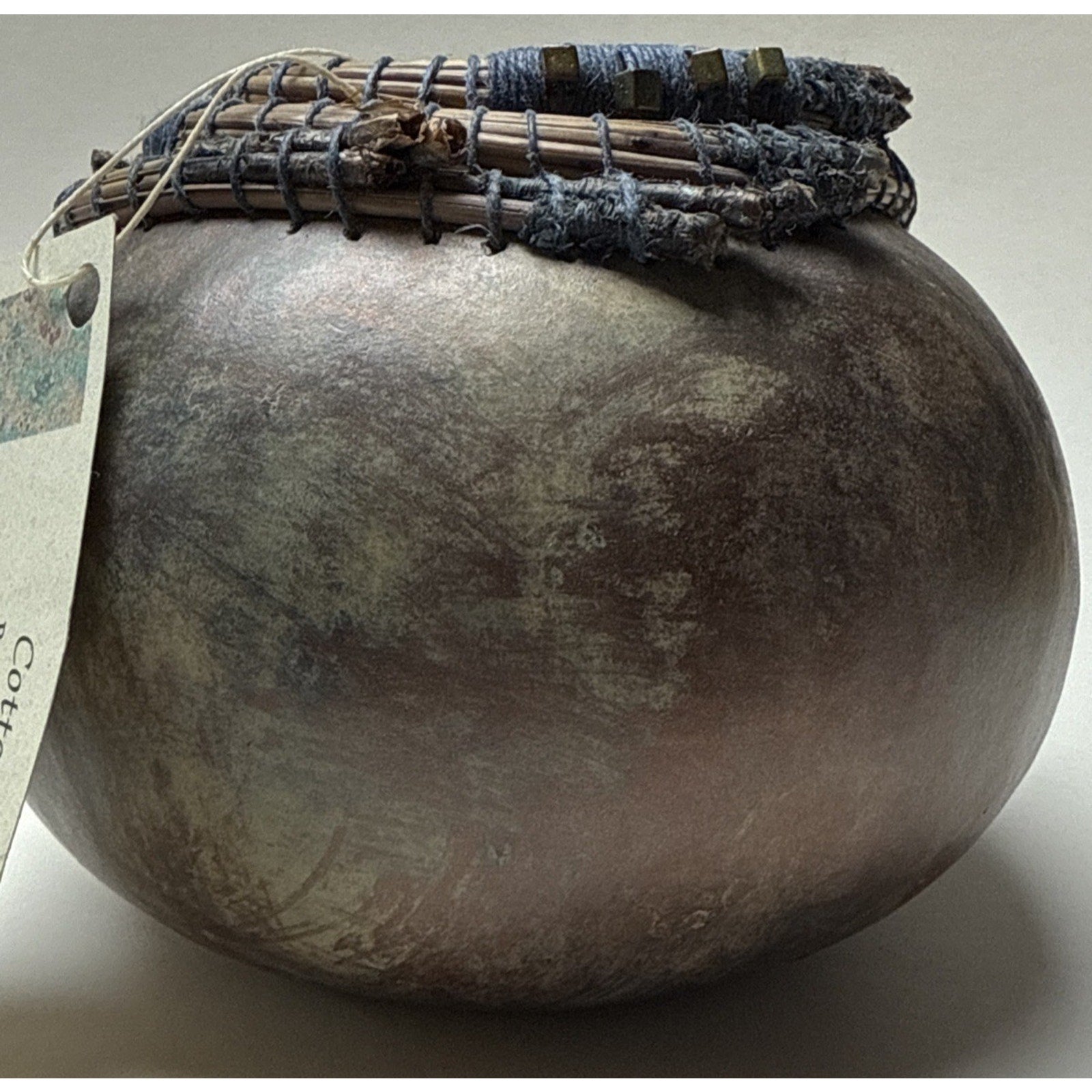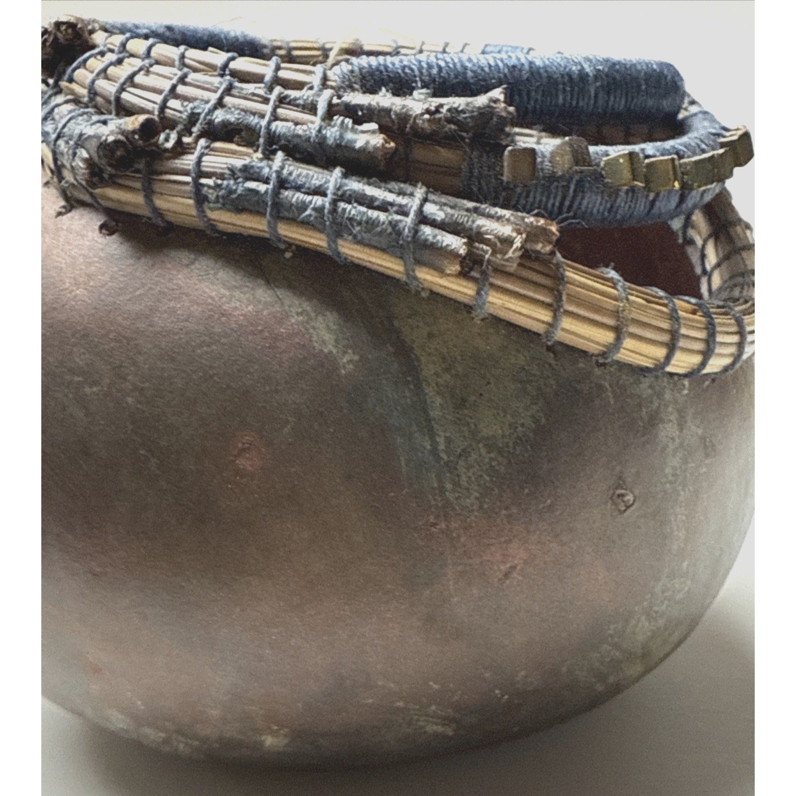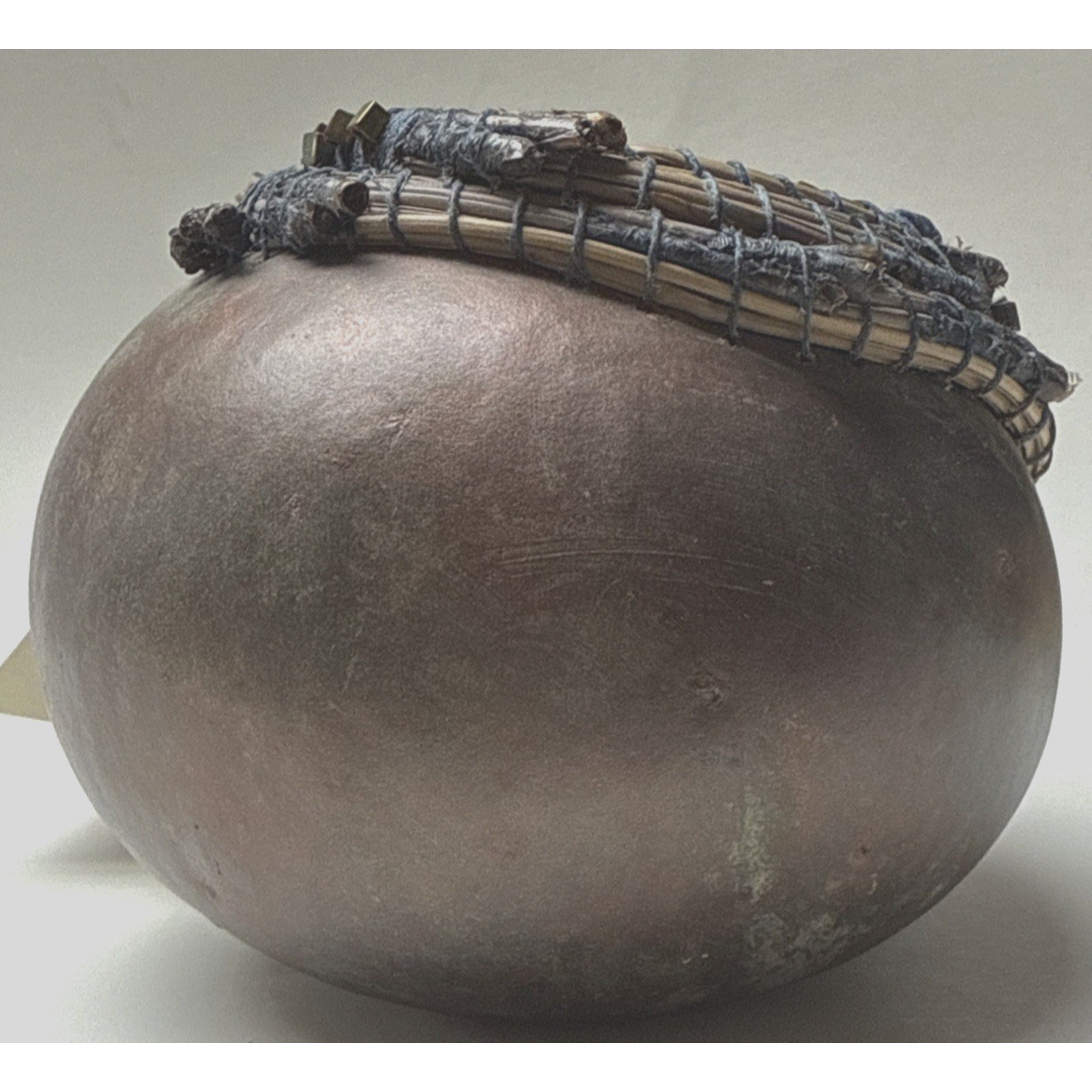 Item is in good condition, but may require additional cleaning. The wound wicker at the top is threaded and beaded. It measures approx 4.25 inches tall x 5.25 inches wide.