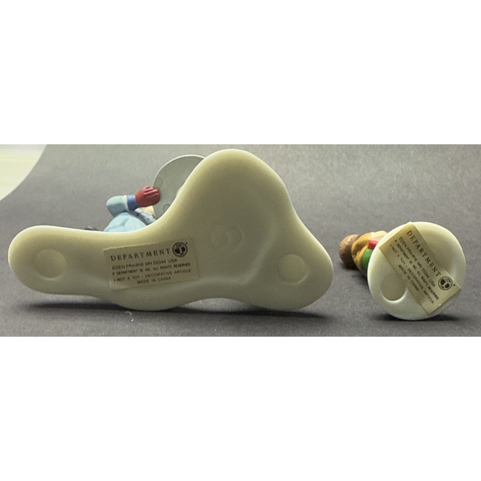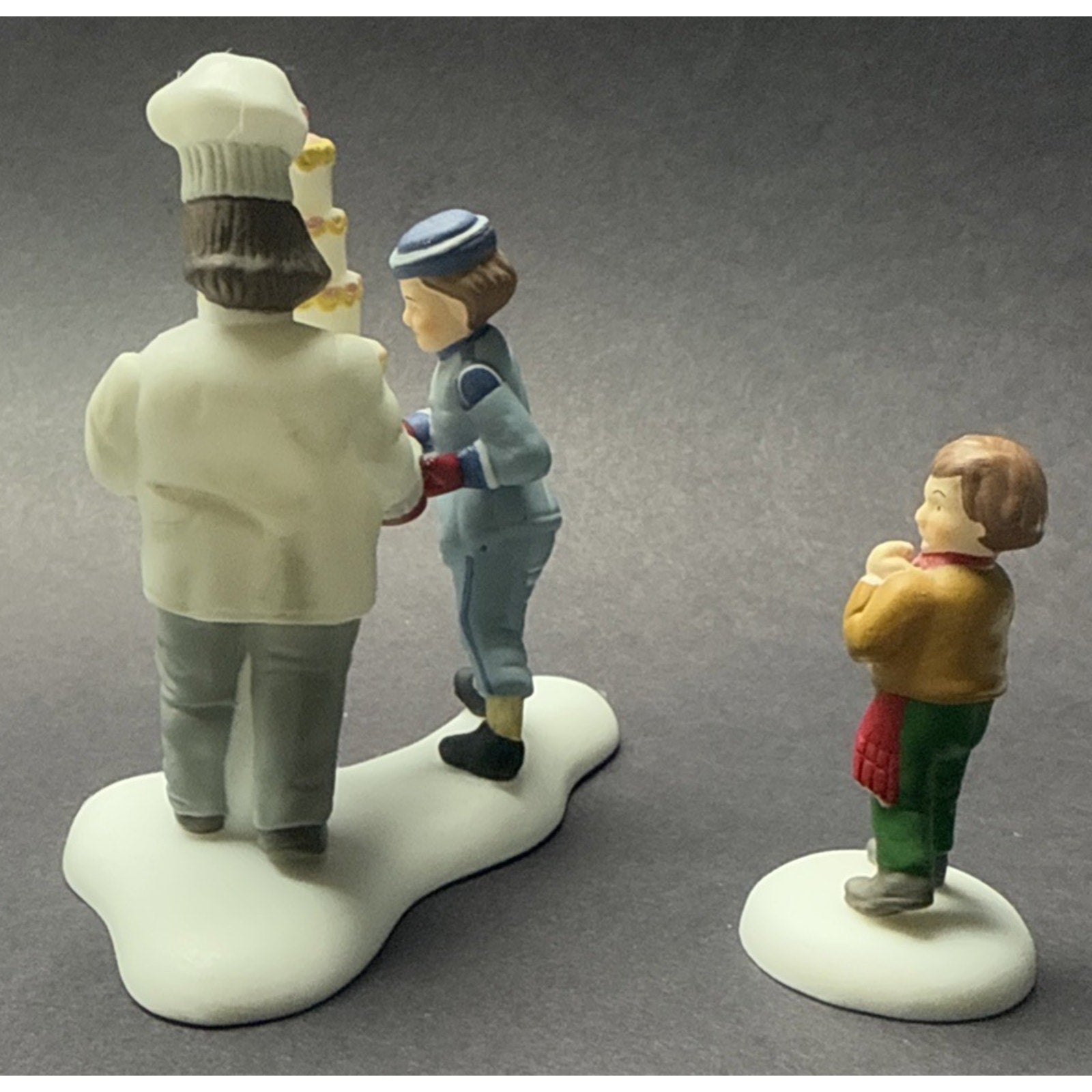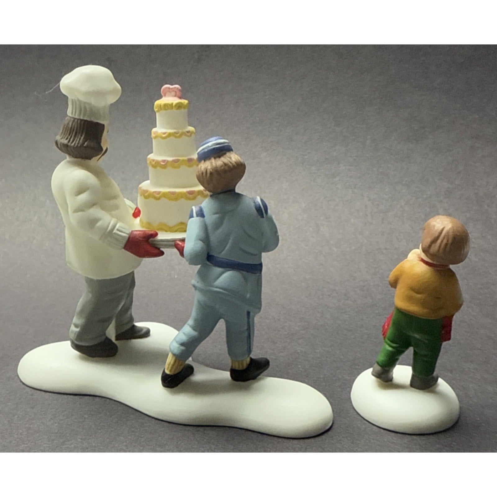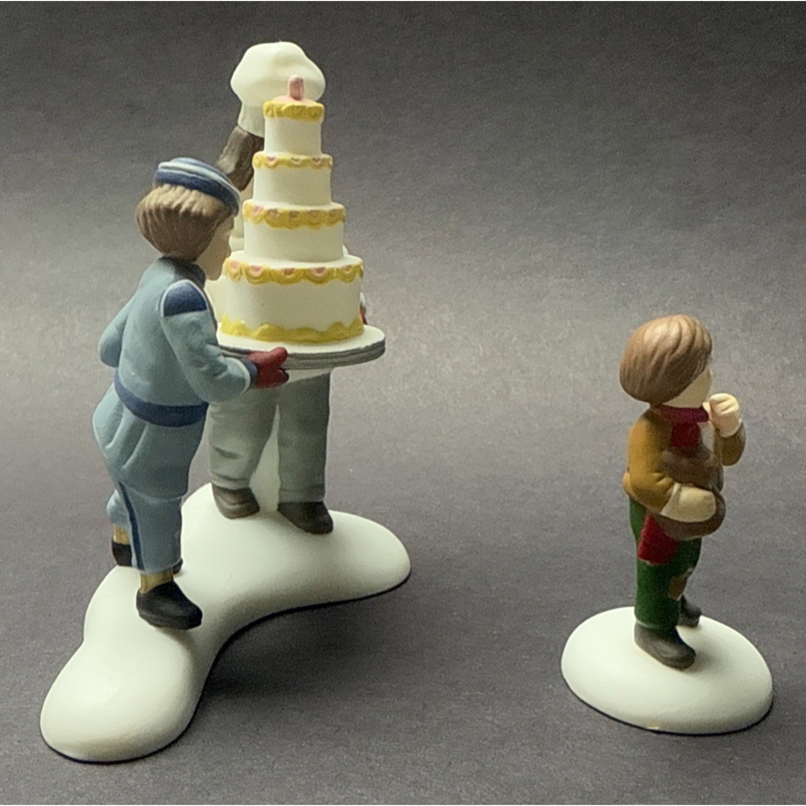 Lovely duo is in good condition with minor wear such as discolorations, scratches, and scuffs. The cake figurine stands approx 2.75 inches tall x 3 x 1.5. The other figurine is approx 1.75 inches tall.