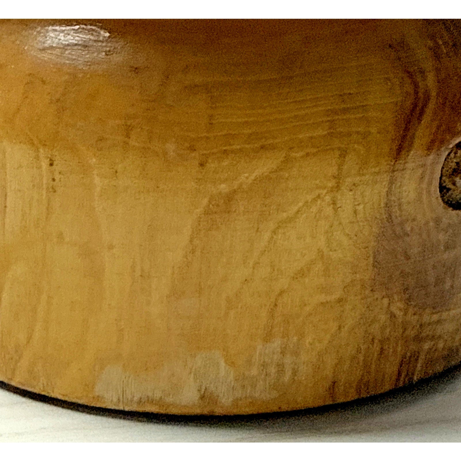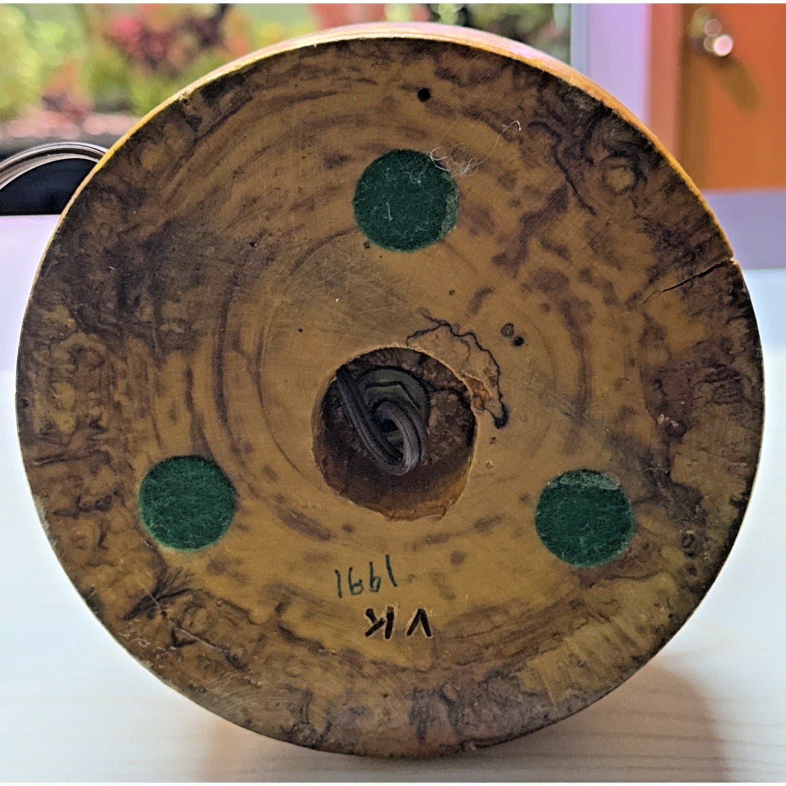 Item comes from an estate. Artist initials are on the bottom. There are splits in the wood which is most likely age. There are also scuffs and scratches to the wood. I am unsure of the wood, but I believe it is burlwood. The base measures approx 15 inches tall, to the very top of the finial it measures approx 29.5 inches. The base measures approx 5.75 inches wide.