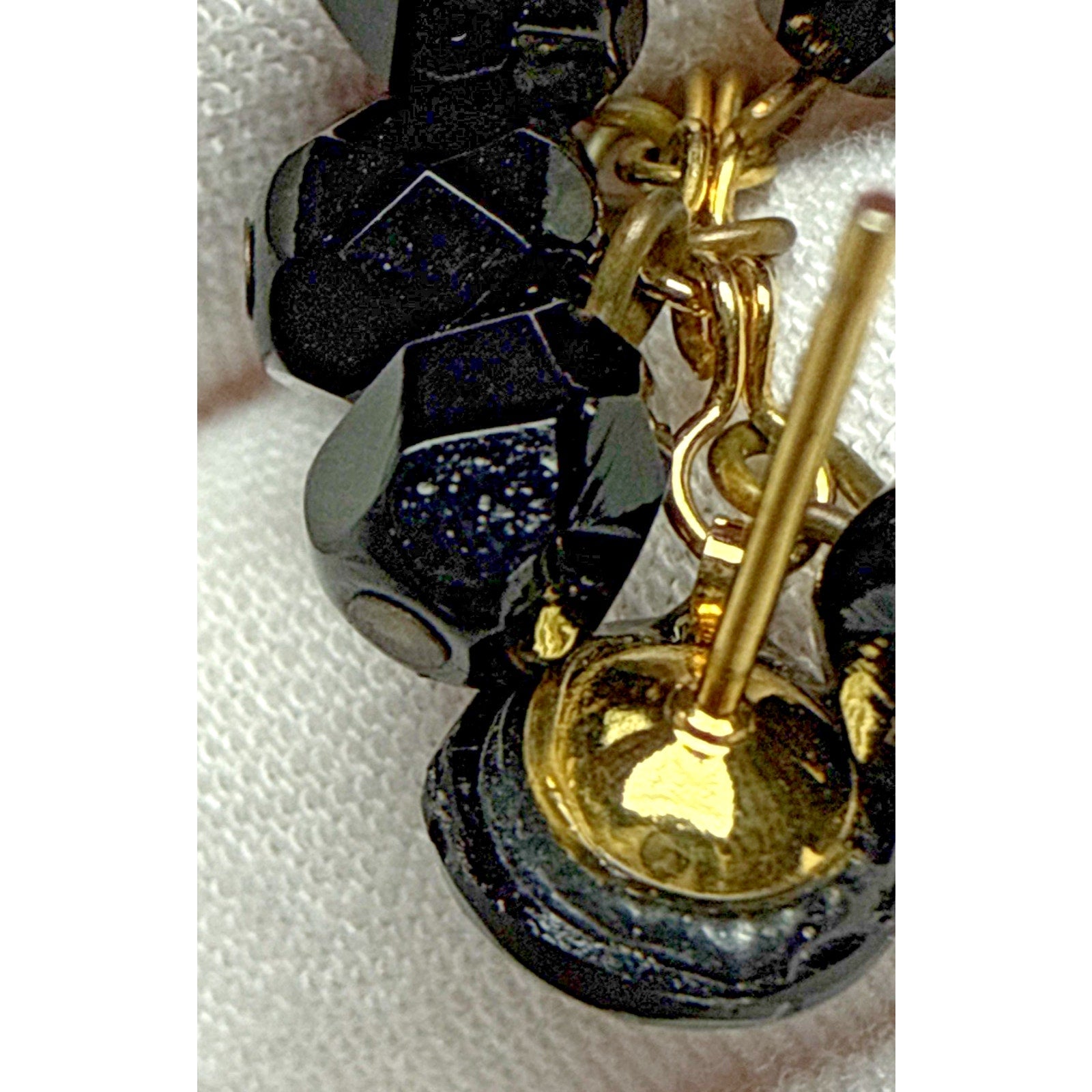 Lovely vintage earrings. There are some scuffs, scratches, and tiny chips. Black beads have bubbling which could be resin or glue. Beads may be marked, but I cannot make the marks out. They measure approx 1.5 inches long x .5.