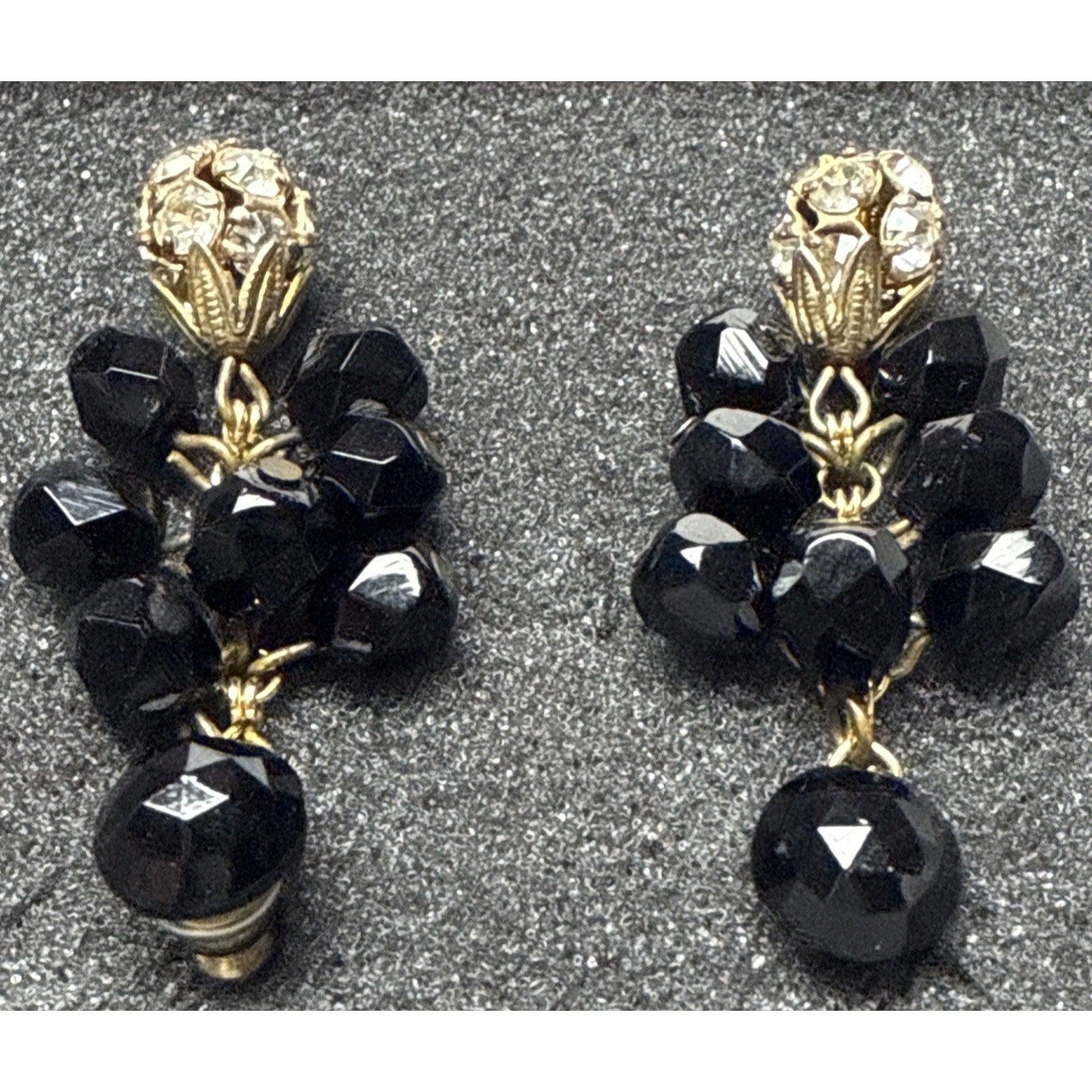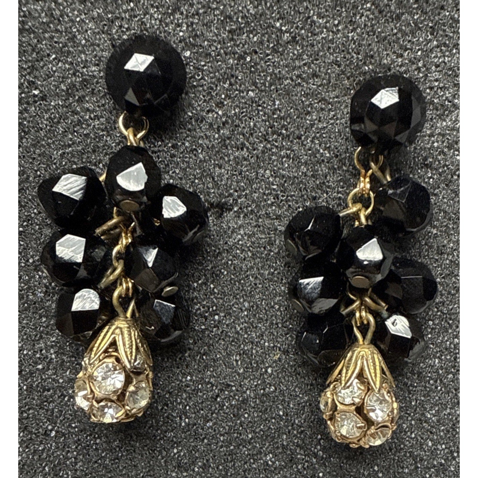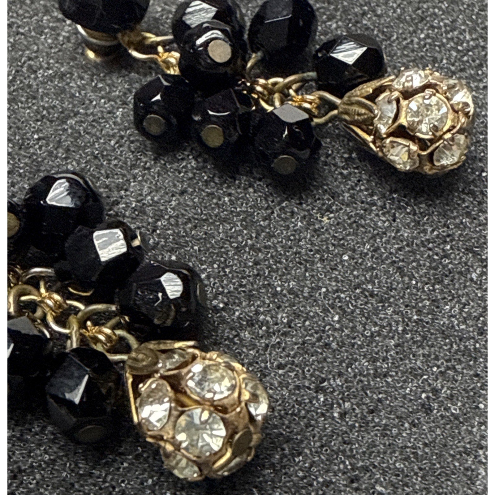 Vtg Black Faceted Glass Cluster Dangle Drop Earrings Disco Ball Rhinestone As-Is