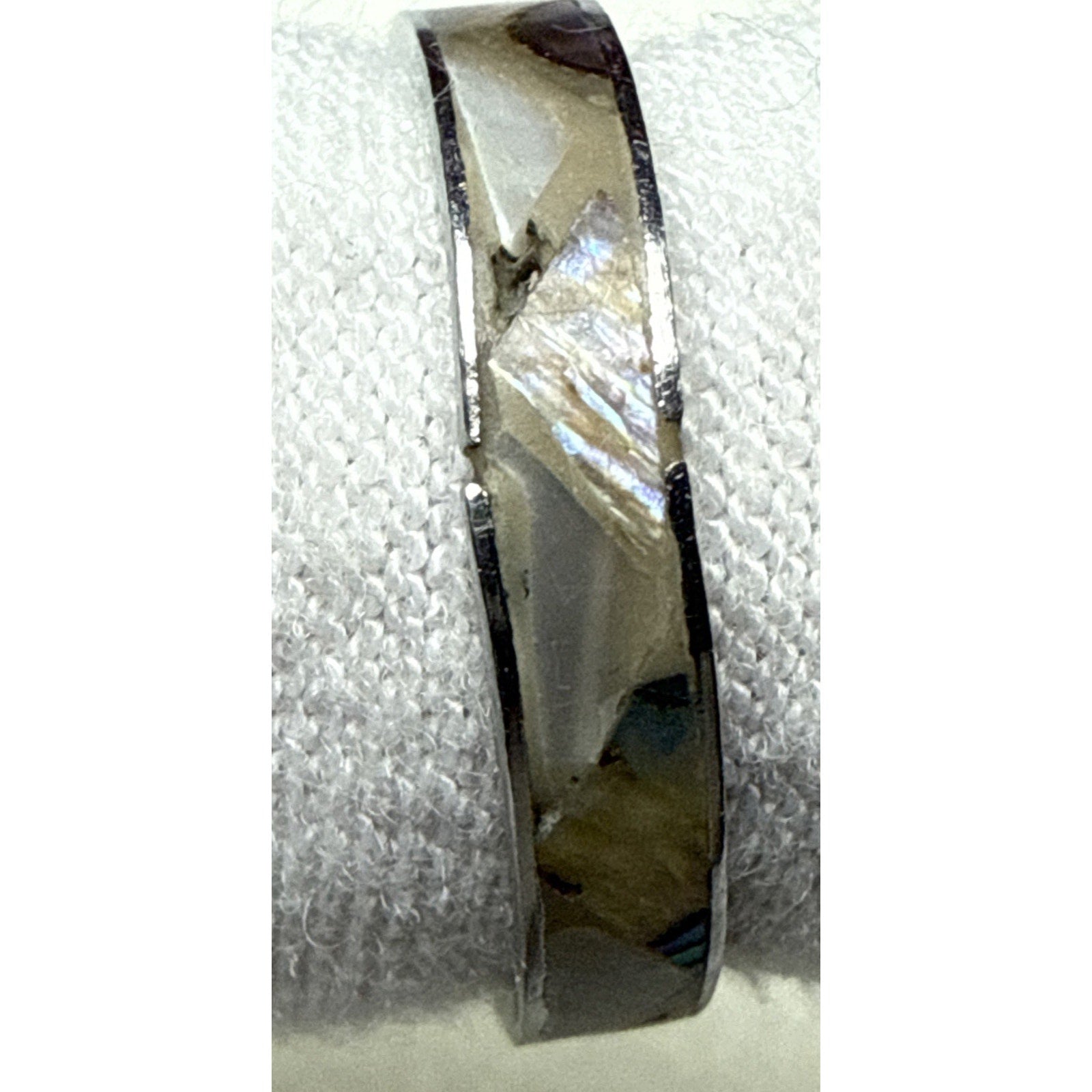 Stunning piece has a visible seam, and the abalone/shell is cracked, or pieces are missing. The band appears uneven in areas.